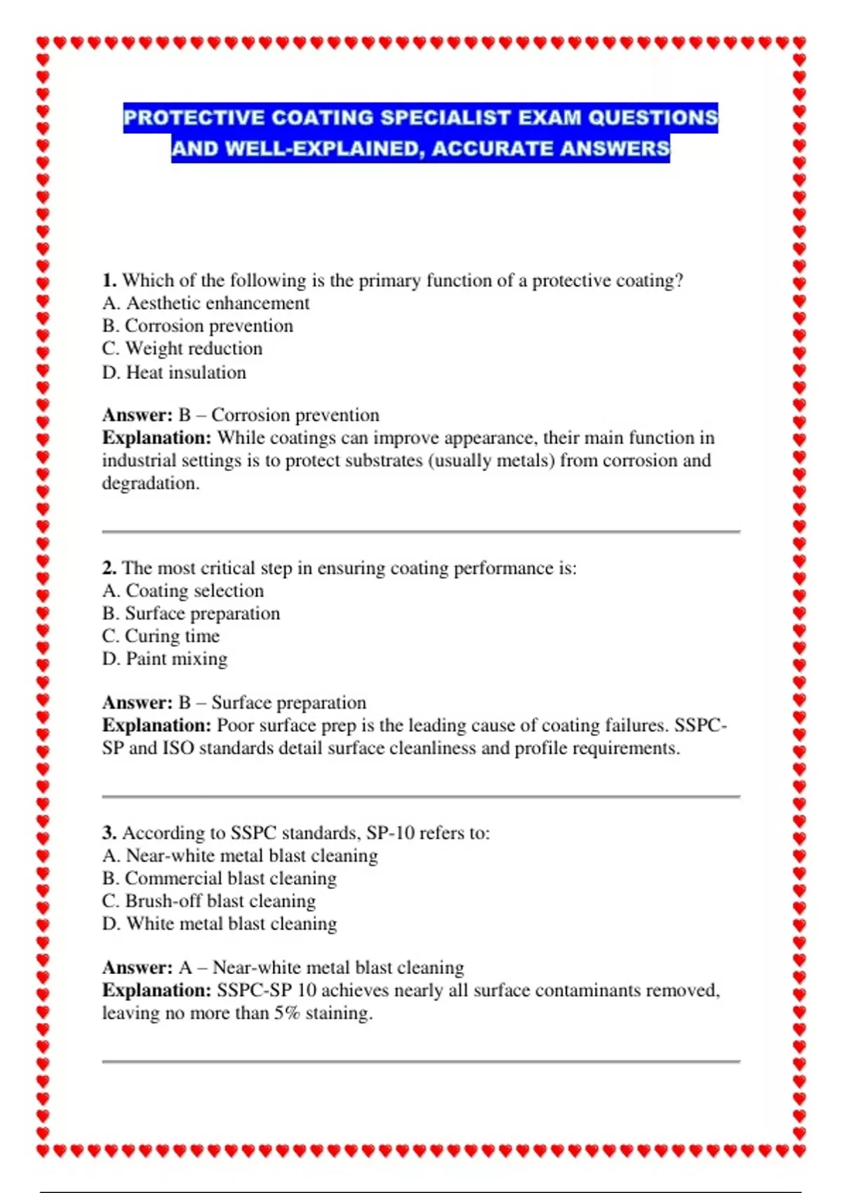PROTECTIVE COATING SPECIALIST EXAM QUESTIONS AND WELL-EXPLAINED, ACCURATE ANSWERS....