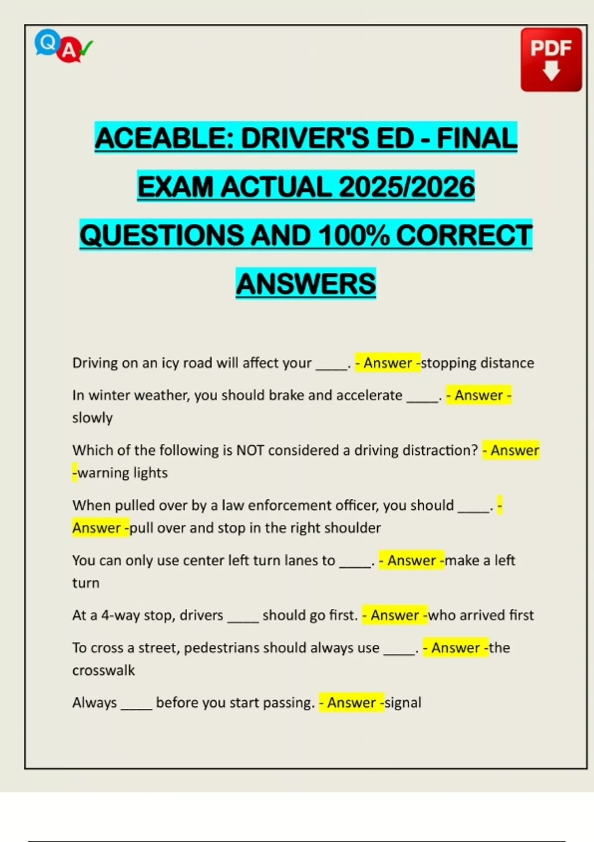 ACEABLE: DRIVER'S ED - FINAL EXAM ACTUAL 2025/2026 QUESTIONS AND 100% CORRECT ANSWERS Driving on an icy road will affect your ____. - Answer -stopping distance In winter weather, you should brake and accelerate ____. - Answer - slowly Which of the following is NOT considered a driving distraction? - Answer -warning lights When pulled over by a law enforcement officer, you should ____. - Answer -pull over and stop in the right shoulder You can only use center left tu