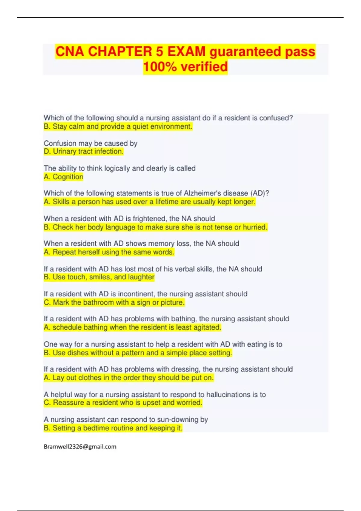 CNA Chapter 5 Exam Questions & Answers (100% Verified) – Alzheimer’s Care & Infection Control