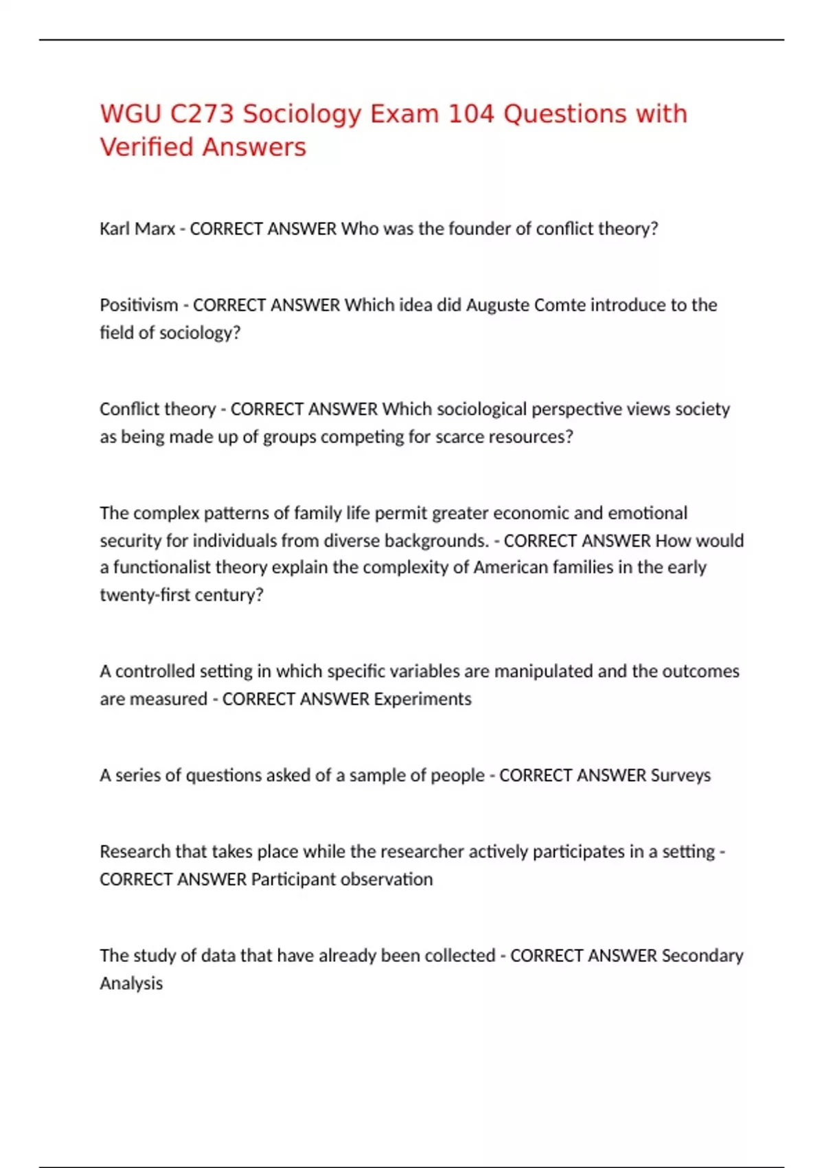 WGU C273 Sociology Exam 104 Questions with Verified Answers Karl Marx - CORRECT ANSWER Who was the founder of conflict theory? Positivism - CORRECT ANSWER Which idea did Auguste Comte introduce to the field of sociology? Conflict theory - CORRECT ANSWER Which sociological perspective views society as being made up of groups competing for scarce resources? The complex patterns of family life permit greater economic and emotional security for individuals from diverse backgrounds. - CORRECT ANSWER How would a functionalist theory explain the complexity of American families in the early twenty-first century? A controlled setting in which specific variables are manipulated and the outcomes are measured - CORRECT ANSWER Experiments A series of questions asked of a sample of people - CORRECT ANSWER Surveys Research that takes place while the researcher actively participates in a setting - CORRECT ANSWER Participant observation The study of data that have already been collected - CORRECT ANSWER Secondary Analysis To protect human subjects - CORRECT ANSWER What is the purpose of having ethical standards in social research? Because people have the right to give informed consent before participating in research - CORRECT ANSWER Why is it considered unethical for sociologists to mislead their research participants? Language - CORRECT ANSWER What is an example of non-material culture?
