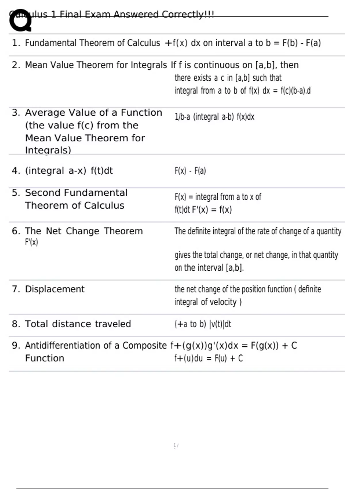 1. Fundamental Theorem of Calculus +f(x) dx on interval a to b = F(b) - F(a)