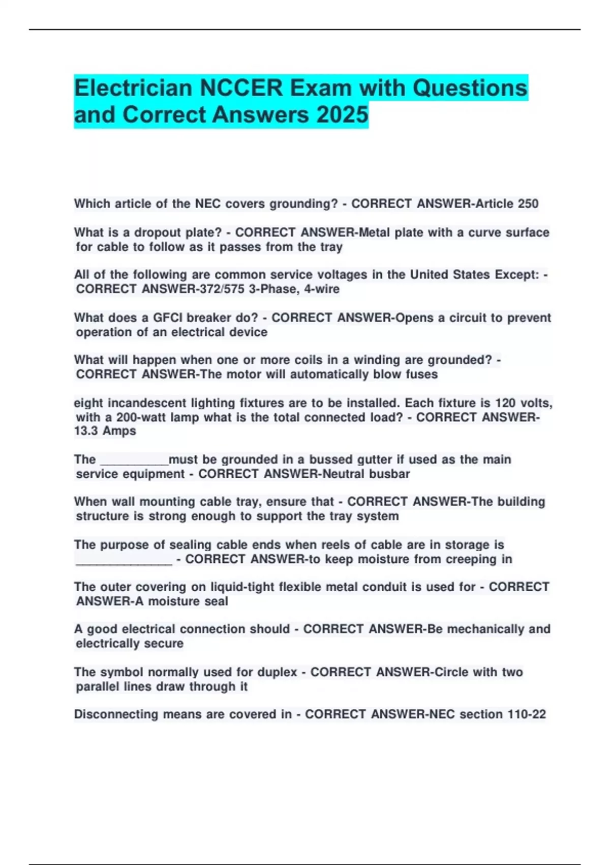 Electrician NCCER Exam with Questions and Correct Answers 2025.