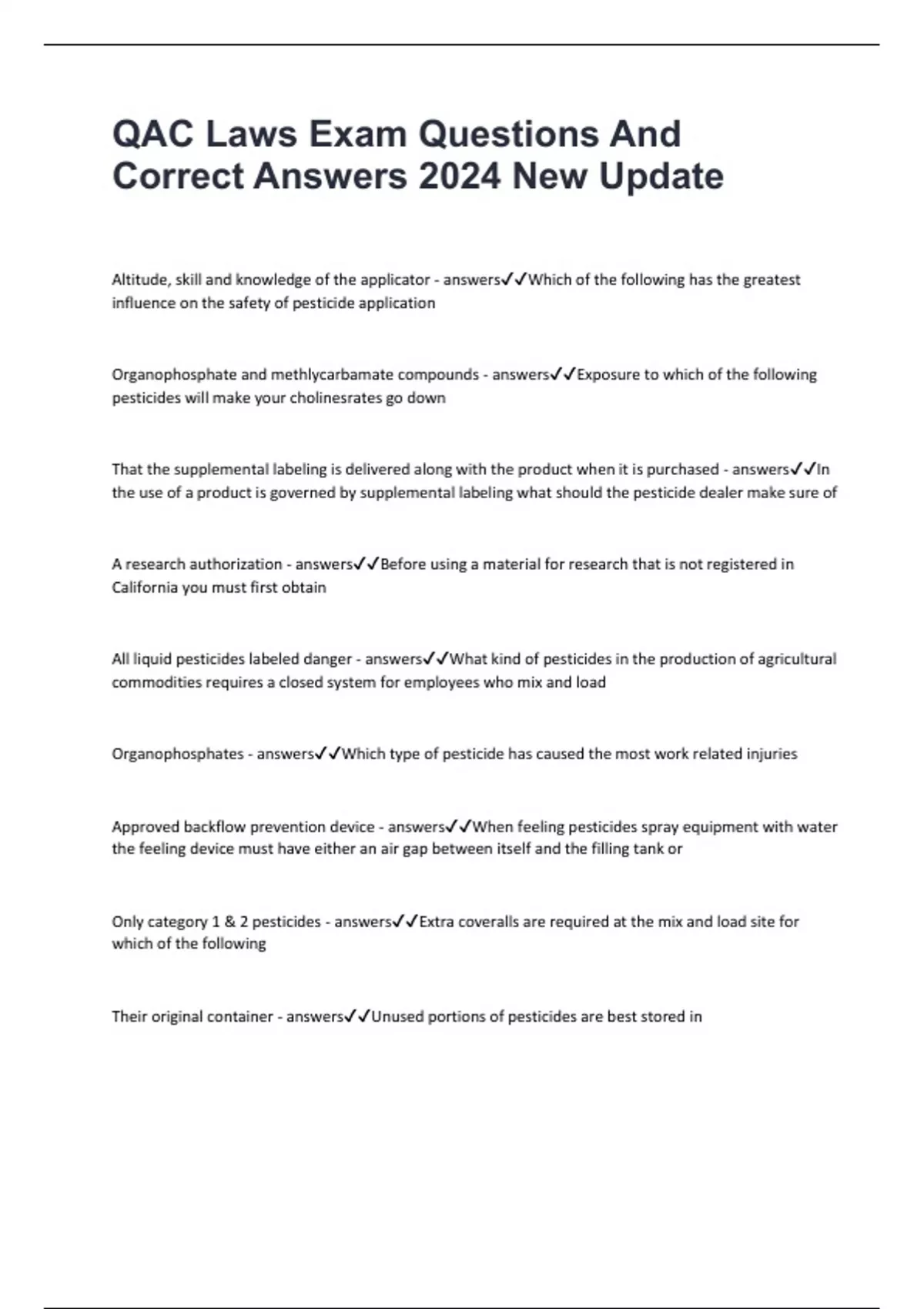 Only category 1 & 2 pesticides - answers✔✔Extra coveralls are required at the mix and load site for