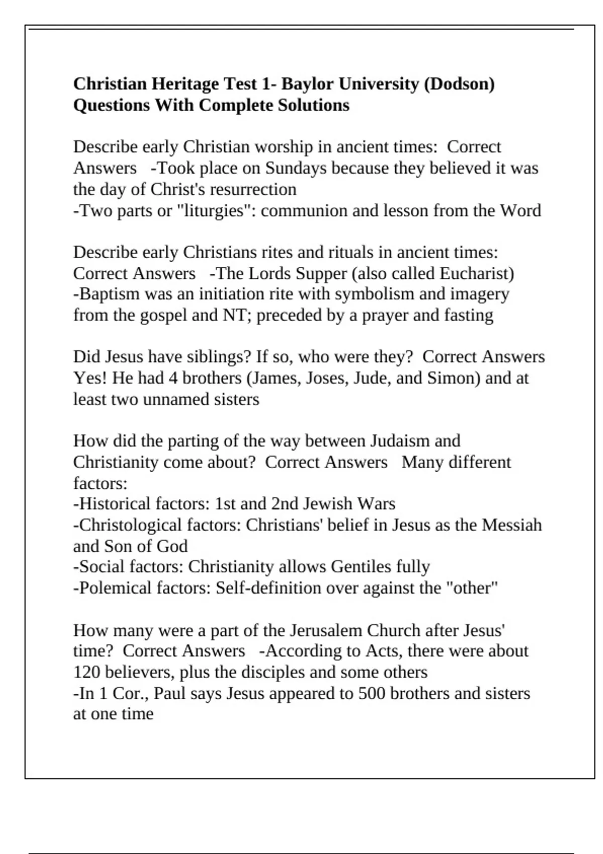 Christian Heritage Test 1- Baylor University (Dodson) Questions With Complete Solutions