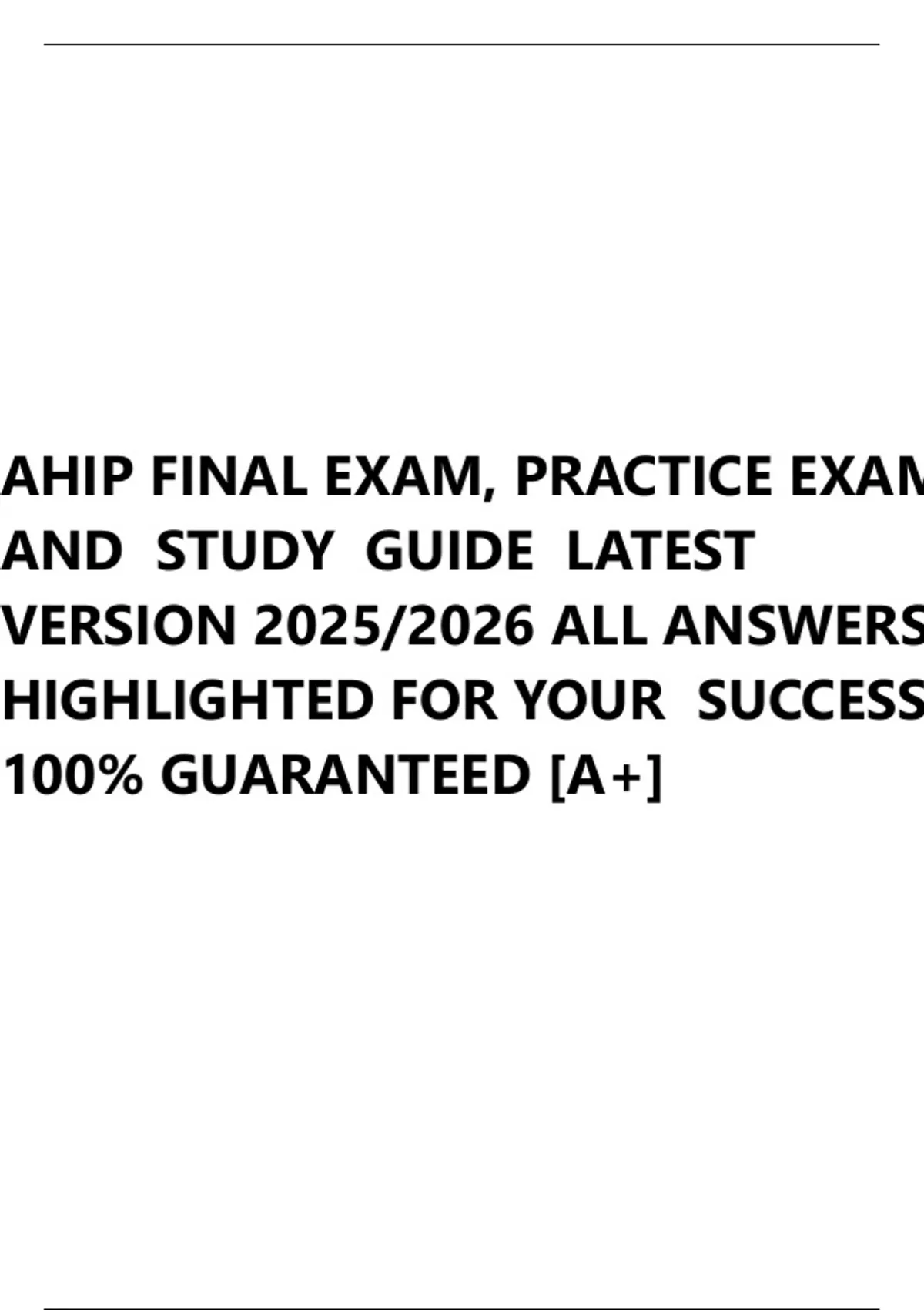 AHIP FINAL EXAM, PRACTICE EXAM AND STUDY GUIDE LATEST VERSION 2025/2026 ALL ANSWERS HIGHLIGHTED FOR YOUR SUCCESS 100% GUARANTEED [A+]