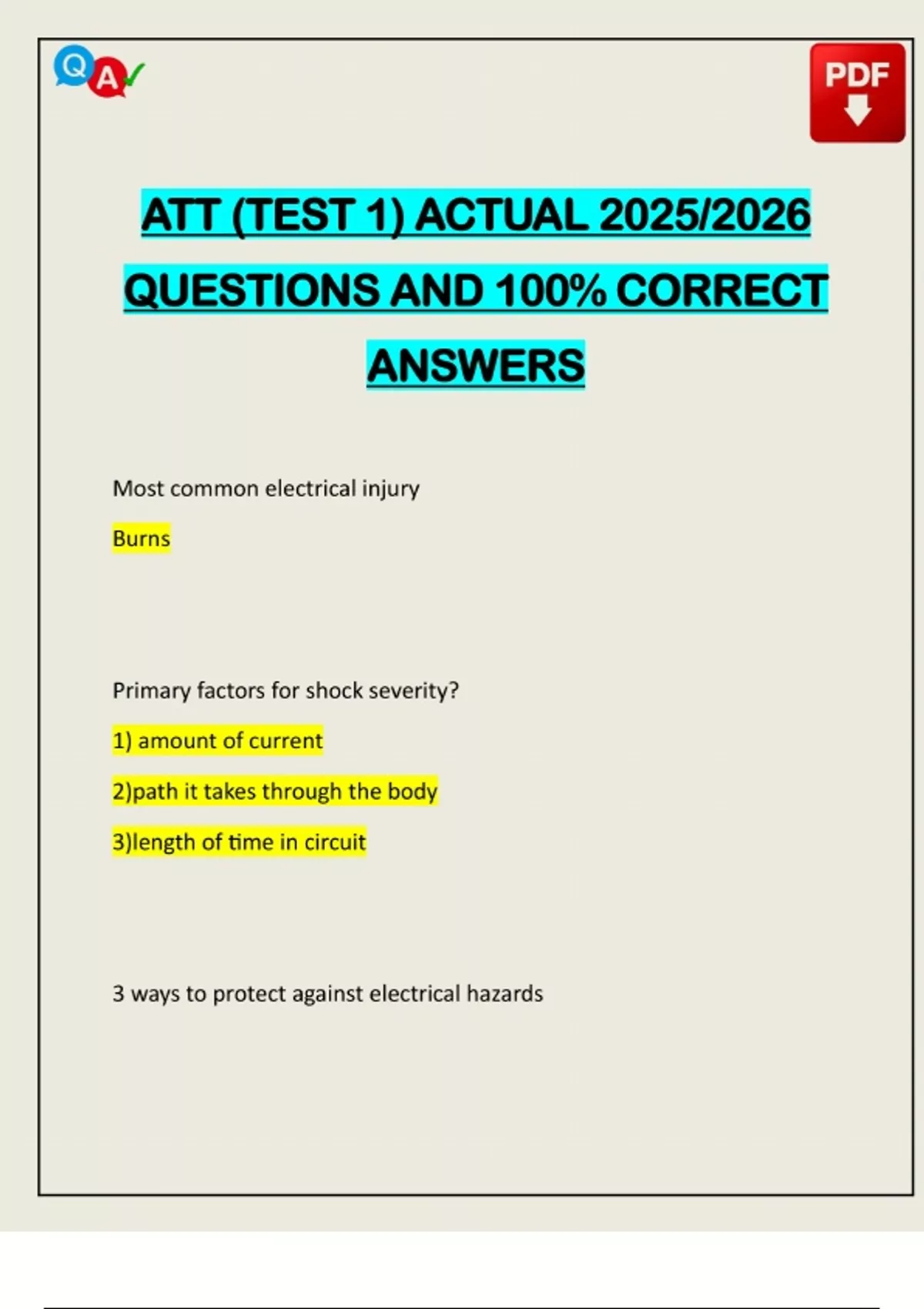 ATT (TEST 1) ACTUAL 2025/2026 QUESTIONS AND 100% CORRECT ANSWERS Most common electrical injury Burns Primary factors for shock severity? 1) amount of current 2)path it takes through the body 3)length of time in circuit 3 ways to protect against electrical hazardsNeed assistance in Online classes, Exams & Assignments? Reach out for Full Course Assistance, Plagiarism-free Essay Writing, Research Paper & Discussion Posts. Confidential & Secure! Email now at: 1)insulation 2)guarding 3)grounding Definition of class C fire Electrical fire PASS definition (fire extinguisher