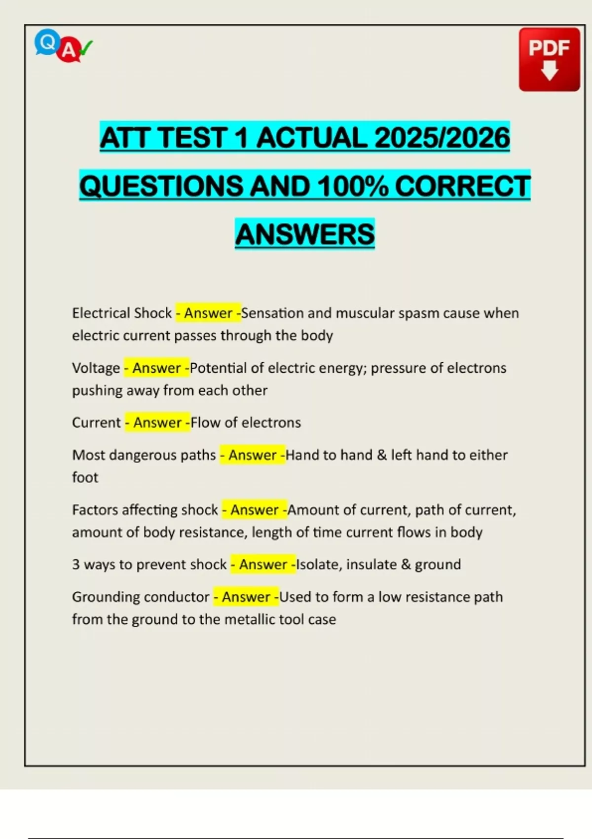 ATT TEST 1 ACTUAL 2025/2026 QUESTIONS AND 100% CORRECT ANSWERS Electrical Shock - Answer -Sensation and muscular spasm cause when electric current passes through the body Voltage - Answer -Potential of electric energy; pressure of electrons pushing away from each other Current - Answer -Flow of electrons Most dangerous paths - Answer -Hand to hand & left hand to either foot Factors affecting shock - Answer -Amount of current, path of current, amount of body resistance, length of time current flows in body 3 ways to prevent shock - Answer -Isolate, insulate & ground Grounding conductor - Answer -Used to form a low resistance path from the ground to the metallic tool caseNeed assistance in Online classes, Exams & Assignments? Reach out for Full Course Assistance, Plagiarism-free Essay Writing, Research Paper & Discussion Posts. Confidential & Secure! Email now at: 12MA - Answer -Minimum AC current required to cause severe musc
