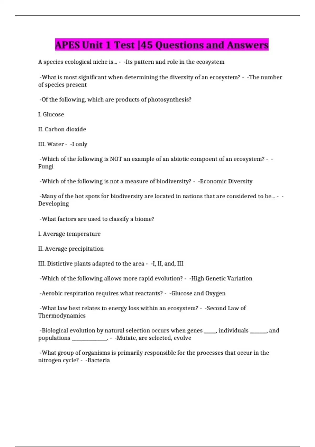 APES Unit 1 Test |45 Questions and Answers