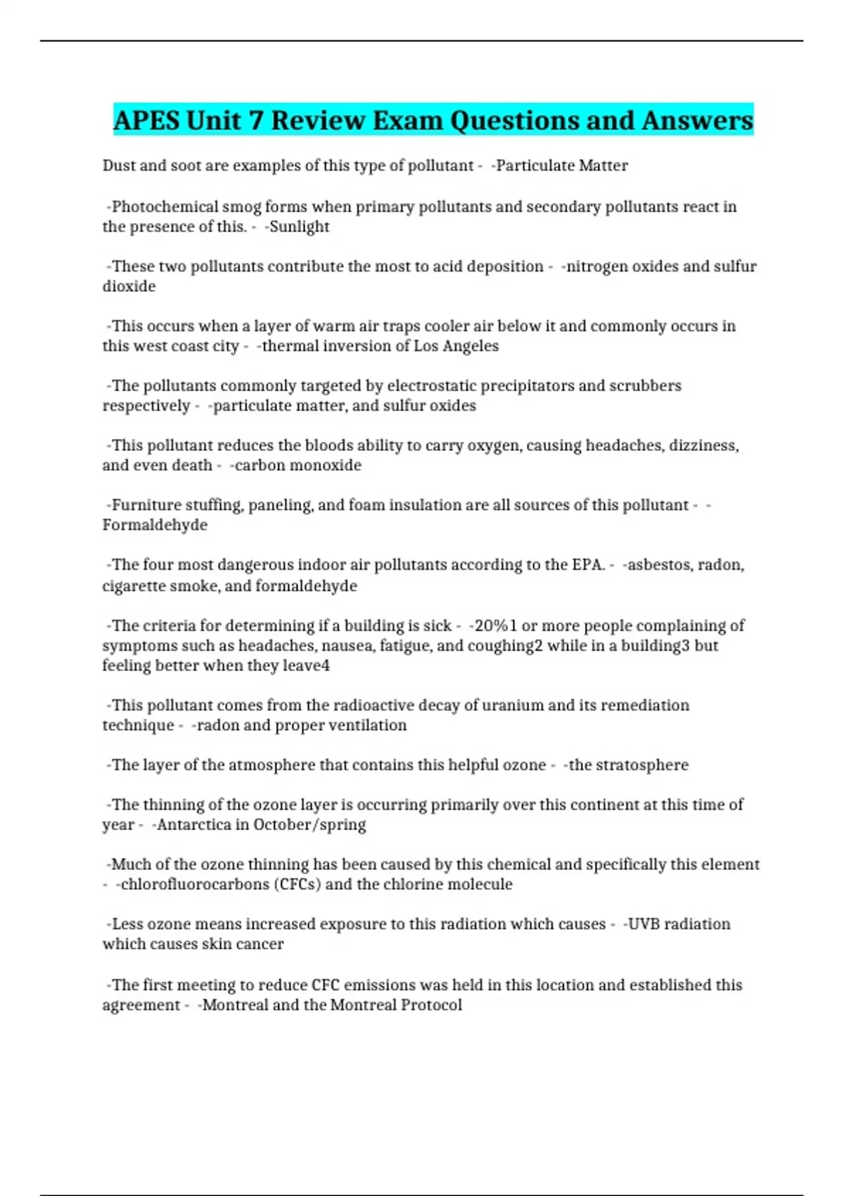 APES Unit 7 Review Exam Questions and Answers