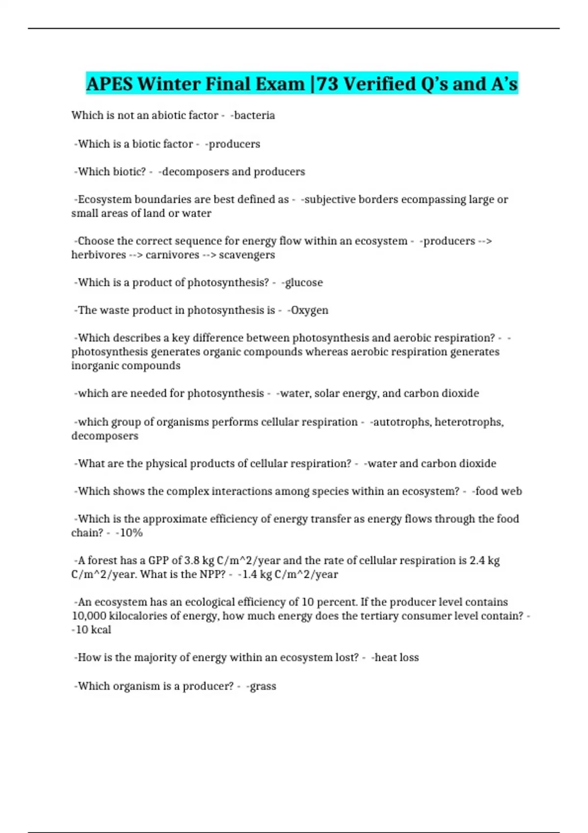 APES Winter Final Exam |73 Verified Q’s and A’s