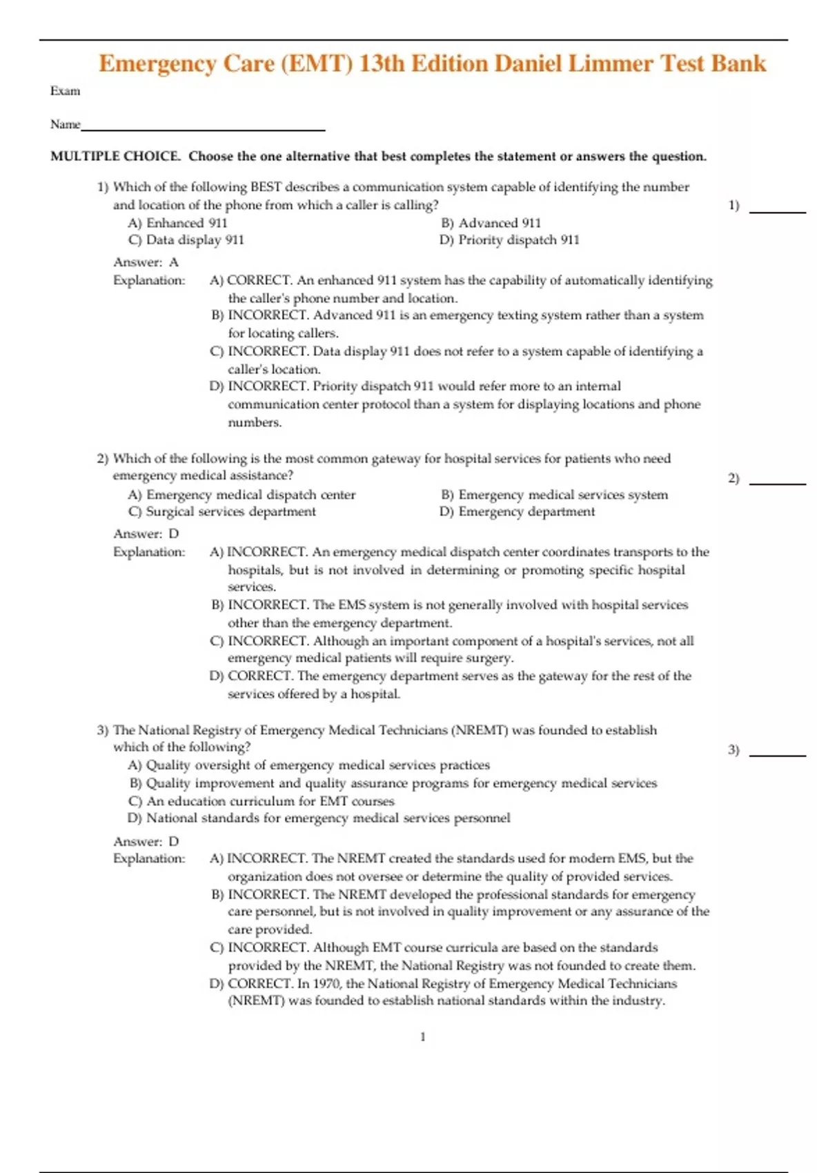 Emergency Care (EMT) 13th Edition Daniel Limmer Test Bank