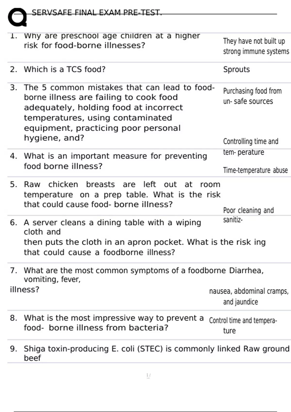 SERVSAFE FINAL EXAM PRE-TEST. 1. Why are preschool age children at a higher risk for food-borne illnesses? They have not built up strong immune systems 2. Which is a TCS food? Sprouts 3. The 5 common mistakes that can lead to food-borne illness are failing to cook food adequately, holding food at incorrect temperatures, using contaminated equipment, practicing poor personal hygiene, and? 4. What is an important measure for preventing food borne illness? 5. Raw chicken breasts are left out at room temperature on a prep table. What is the risk that could cause food- borne illness? 6. A server cleans a dining table with a wiping cloth and Purchasing food from un- safe sources Controlling time and tem- perature Time-temperature abuse Poor cleaning and sanitiz- then puts the cloth in an apron pocket. What is the risk ing that could cause a foodborne illness? 7. What are the most common symptoms of a foodborne Diarrhea, vomiting, fever, illness? 8. What is the most impressive way to prevent a food- borne illness from bacteria? nausea, abdominal cramps, and jaundice Control time and tempera- ture 9. Shiga toxin-producing E. coli (STEC) is commonly linked Raw ground beef with what type of food? 10. What is the most important way to prevent a food- borne illness from viruses?