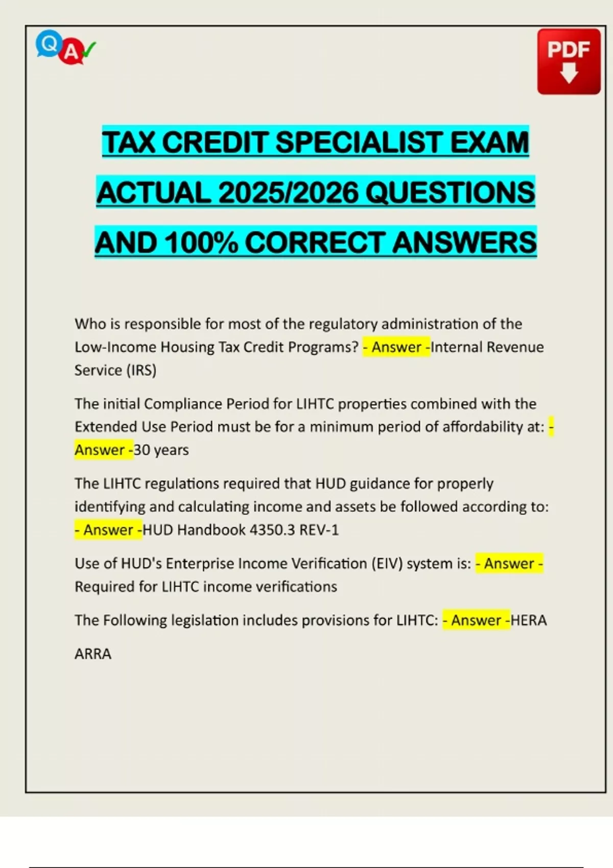 TAX CREDIT SPECIALIST EXAM ACTUAL 2025/2026 QUESTIONS AND 100% CORRECT ANSWERS Who is responsible for most of the regulatory administration of the Low-Income Housing Tax Credit Programs? - Answer -Internal Revenue Service (IRS) The initial Compliance Period for LIHTC properties combined with the Extended Use Period must be for a minimum period of affordability at: - Answer -30 years The LIHTC regulations required that HUD guidance for properly identifying and calculating income and assets be followed according to: - Answer -HUD Handbook 4350.3 REV-1 Use of HUD's Enterprise Income Verification (EIV) system is: - Answer - Required for LIHTC inco