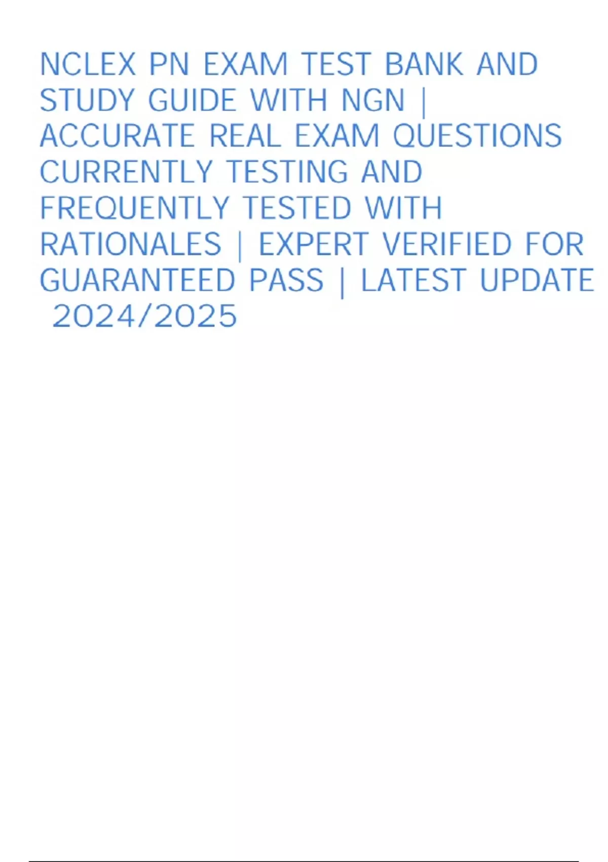 NCLEX PN EXAM TEST BANK AND STUDY GUIDE WITH NGN | ACCURATE REAL EXAM QUESTIONS CURRENTLY TESTING AND FREQUENTLY TESTED WITH RATIONALES | EXPERT VERIFIED FOR GUARANTEED PASS | LATEST UPDATE 2024/2025