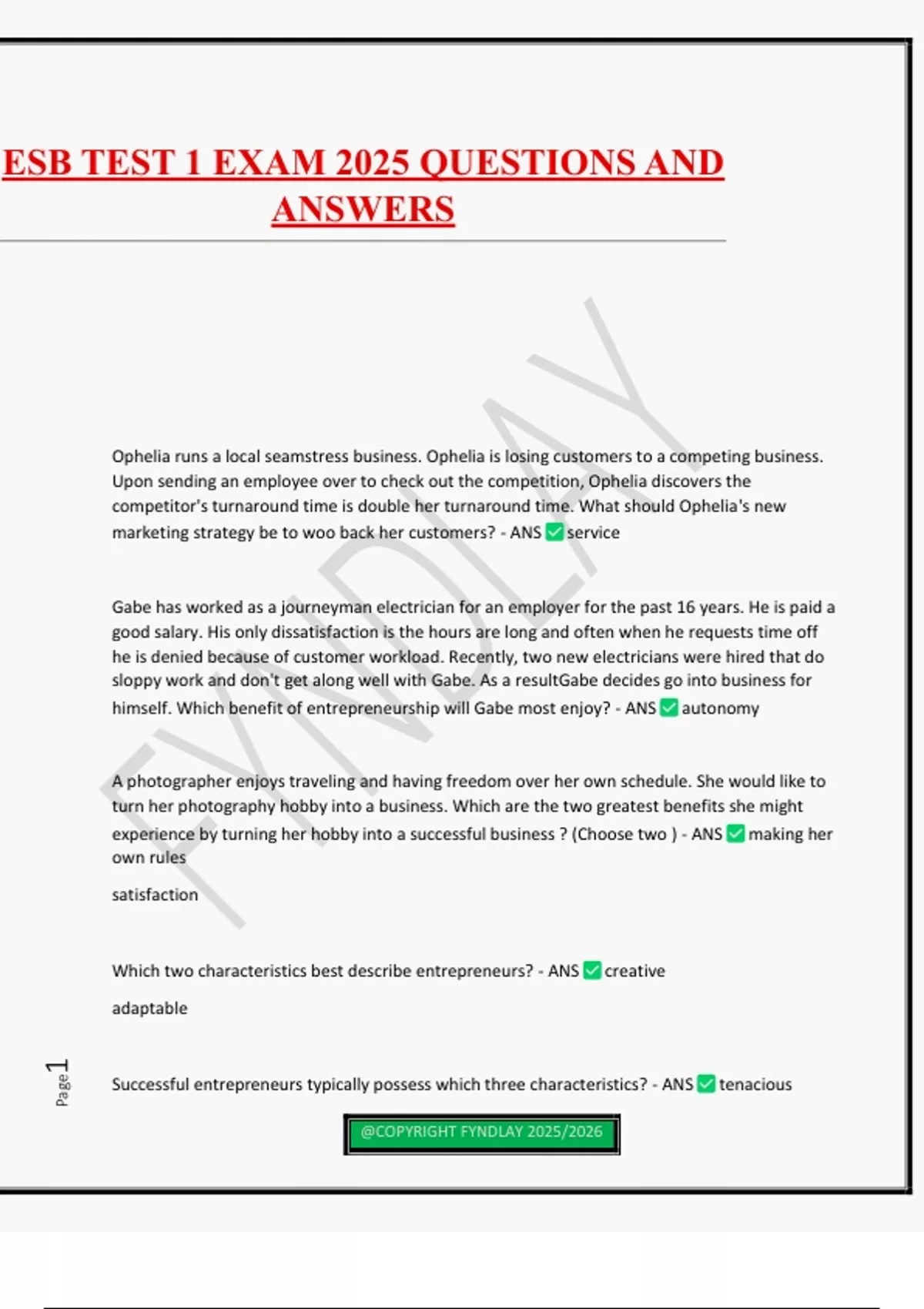 Ophelia runs a local seamstress business. Ophelia is losing customers to a competing business. Upon sending an employee over to check out the competition, Ophelia discovers the competitor's turnaround time is double her turnaround time. What should Ophelia's new marketing strategy be to woo back her customers? - ANS service Gabe has worked as a journeyman electrician for an employer for the past 16 years. He is paid a good salary. His only dissatisfaction is the hours are long and often when he requests time off he is denied because of customer workload. Recently, two new electricians were hired that do sloppy work and don't get along well with Gabe. As a resultGabe decides go into business for himself. Which benefit of entrepreneurship will Gabe most enjoy? - ANS autonomy A photographer enjoys traveling and having freedom over her own schedule. She would like to turn her photography hobby into a business. Which are the two greatest benefits she might experience by turning her hobby into a successful business ? (Choose two ) - ANS making her own rules satisfaction Which two characteristics best describe entrepreneurs? - ANS creative adaptable Successful entrepreneurs typically possess which three characteristics? - ANS tenacious ESB TEST 1 EXAM 2025 QUESTIONS AND ANSWERS @COPYRIGHT FYNDLAY 2025/2026 Page2 adaptable responsible Rey has worked as a transportation coordinator for the past 10 years. Rey often is dissatisfied with the stagnation of the job and wants to open her own transportation service. Which benefit of entrepreneurship will be the biggest one for Rey? - ANS autonomy After a self-assessment, a potential entrepreneur has learned that he knows nothing about accounting and keeping records for a business. Based upon this finding, what should this entrepreneur do? - ANS enroll in a beginning level business accounting course at a local community college Which are three risks of entrepreneurship? (Choose three) - ANS financial insecurity potential business failure long hours Which are traits of a successful entrepreneur? Choose three answers. - ANS enthusiastic patient confident Fran works for a flooring company in a neighboring town. Many of Fran's customers complain about a lack of available flooring companies in the area and that of those companies, the prices are too high. Should Fran decide to open a flooring business, what can be a good marketing strategy? - ANS low pri