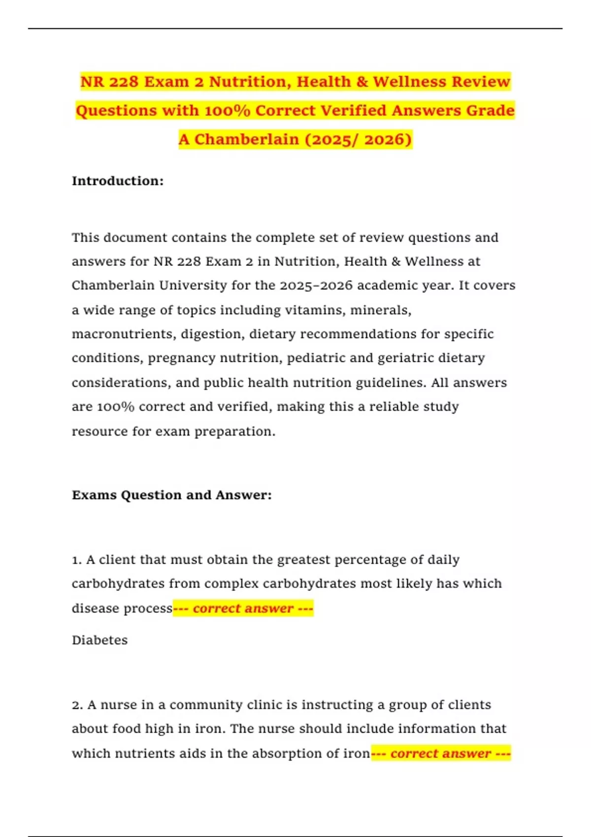 answers for NR 228 Exam 2 in Nutrition, Health & Wellness at