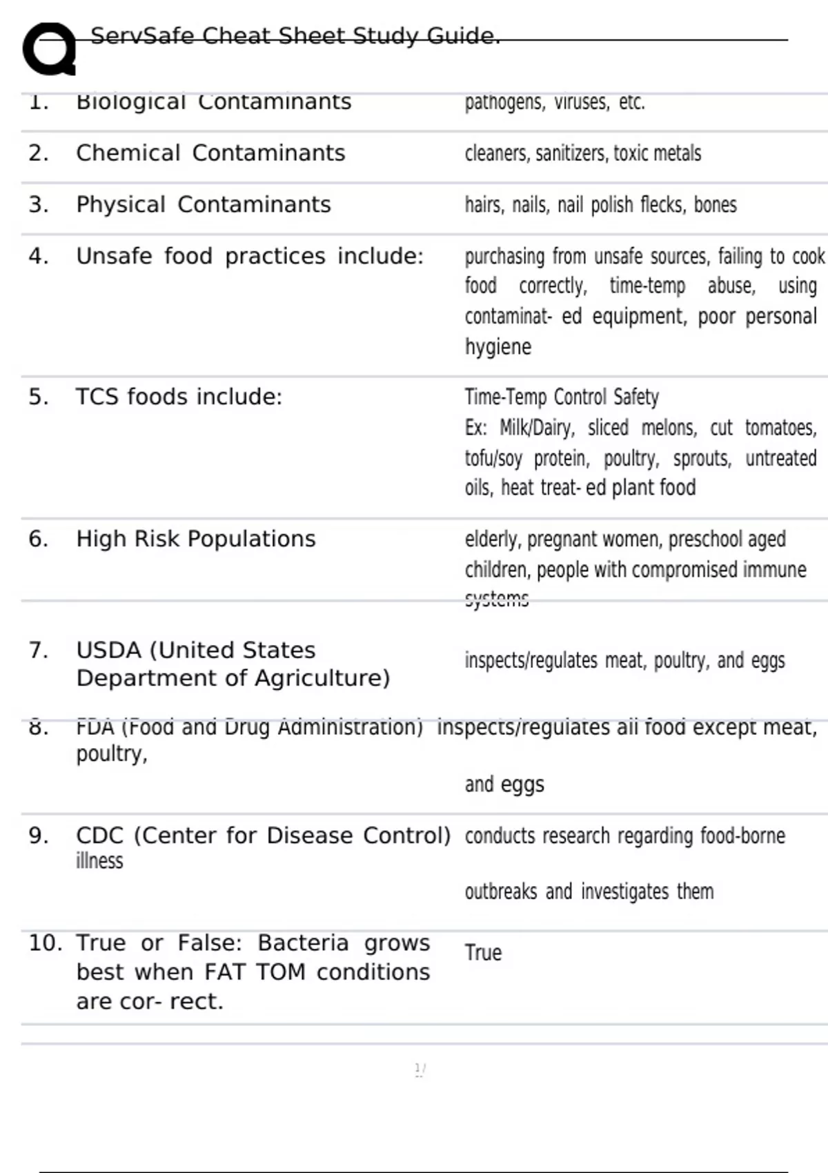 ServSafe Cheat Sheet Study Guide. 1. Biological Contaminants pathogens, viruses, etc. 2. Chemical Contaminants cleaners, sanitizers, toxic metals 3. Physical Contaminants hairs, nails, nail polish flecks, bones 4. Unsafe food practices include: purchasing from unsafe sources, failing to cook food correctly, time-temp abuse, using contaminat- ed equipment, poor personal hygiene 5. TCS foods include: Time-Temp Control Safety Ex: Milk/Dairy, sliced melons, cut tomatoes, tofu/soy protein, poultry, sprouts, untreated oils, heat treat- ed plant food 6. High Risk Populations elderly, pregnant women, preschool aged children, people with compromised immune systems 7. USDA (United States Department of Agriculture) inspects/regulates meat, poultry, and eggs 8. FDA (Food and Drug Administration) inspects/regulates all food except meat, poultry, and eggs 9. CDC (Center for Disease Control) conducts research regarding food-borne illness outbreaks and investigates them 10. True or False: Bacteria grows best when FAT TOM conditions are cor- rect. True 11. FAT TOM stands for: Food, Acidity, Time, Temperature, Oxygen, and Moisture