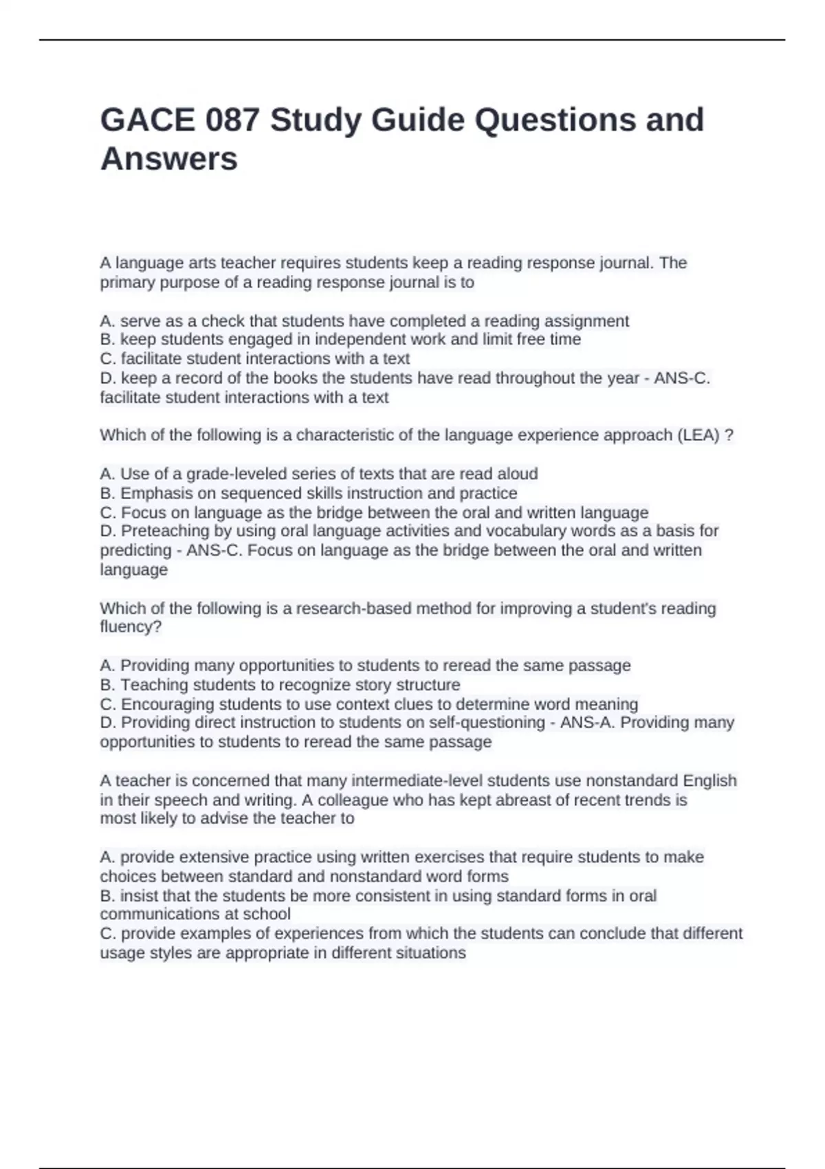 GACE 087 Study Guide Questions and