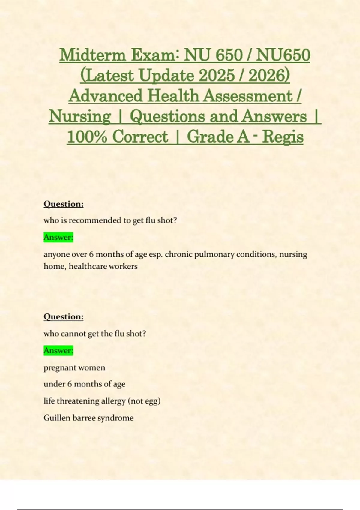 Midterm Exam: NU 650 / NU650 (Latest Update 2025 / 2026) Advanced Health Assessment / Nursing | Questions and Answers | 100% Correct | Grade A - Regis Question: who is recommended to get flu shot? Answer: anyone over 6 months of age esp. chronic pulmonary conditions, nursing home, healthcare workers Question: who cannot get the flu shot? Answer: pregnant women under 6 months of age life threatening allergy (not egg) Guillen barree syndrome