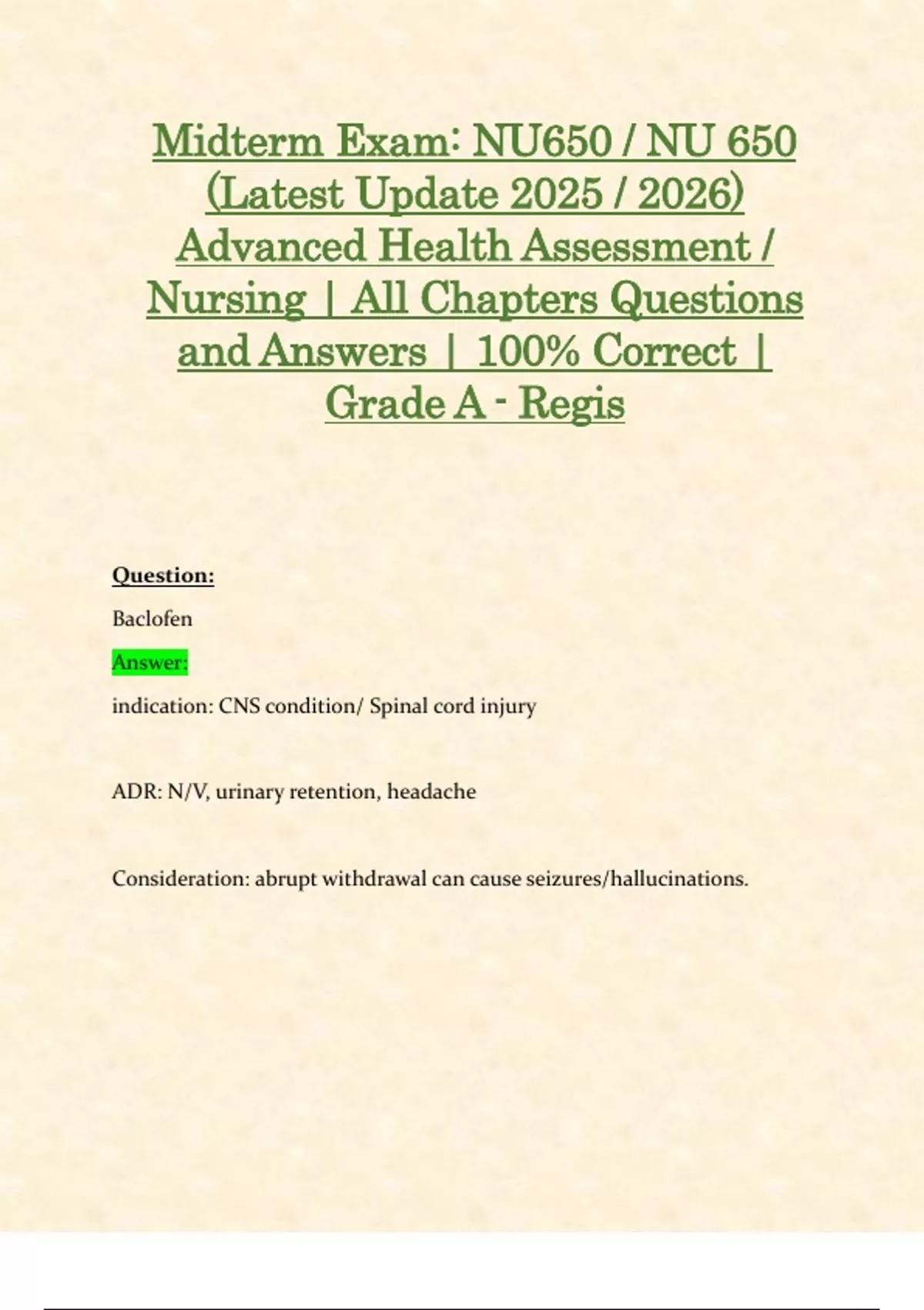 Midterm Exam: NU650 / NU 650 (Latest Update 2025 / 2026) Advanced Health Assessment / Nursing | All Chapters Questions and Answers | 100% Correct | Grade A - Regis Question: Baclofen Answer: indication: CNS condition/ Spinal cord injury ADR: N/V, urinary retention, headache Consideration: abrupt withdrawal can cause seizures/hallucinations. Question: Leflunomide (Arava) Answer: conventional DMARD increased hazard/cost compared to methotrexate MOA: (prodrug) inhibits synthesis of pyrimidines for t cell proliferation and antibody production ADRs: infection, alopecia, pancytopenia and SJS, neuropathy, hepatotoxicity, teratogenic Drug interactions: slow NSAID metabolism. Question: what side effects do most all antispasmotic drugs have Answer: CNS depression and dizziness