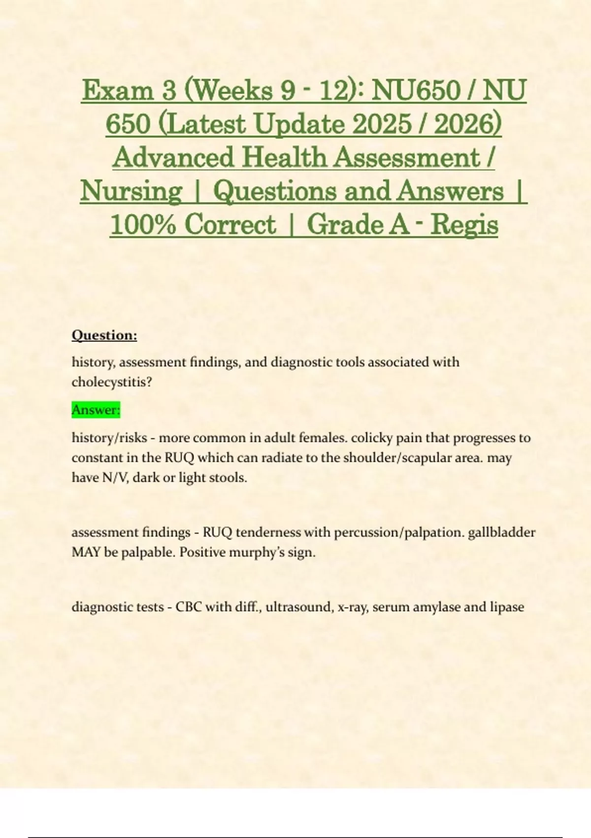 Exam 3 (Weeks 9 - 12): NU650 / NU 650 (Latest Update 2025 / 2026) Advanced Health Assessment / Nursing | Questions and Answers | 100% Correct | Grade A - Regis