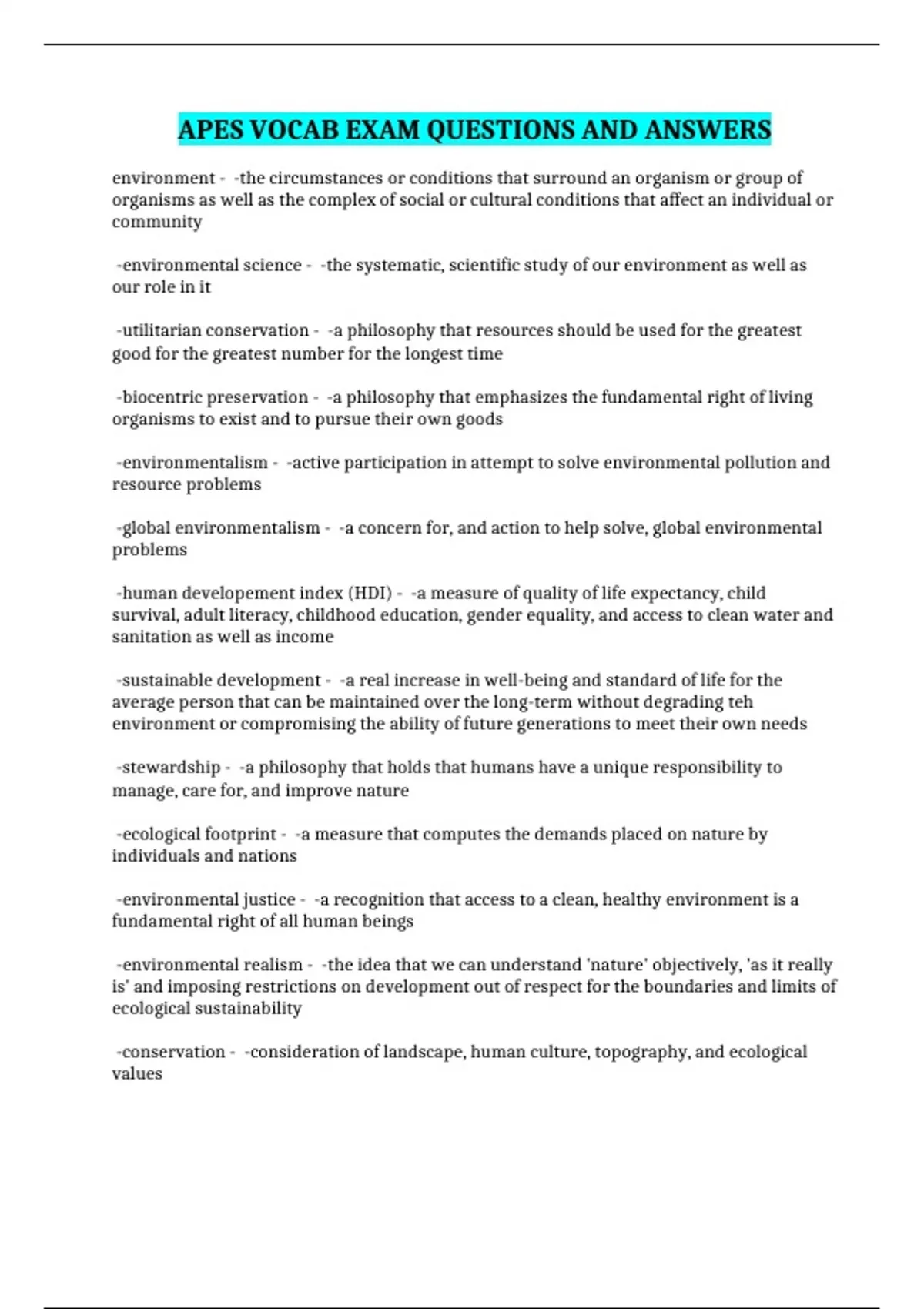 APES VOCAB EXAM QUESTIONS AND ANSWERS