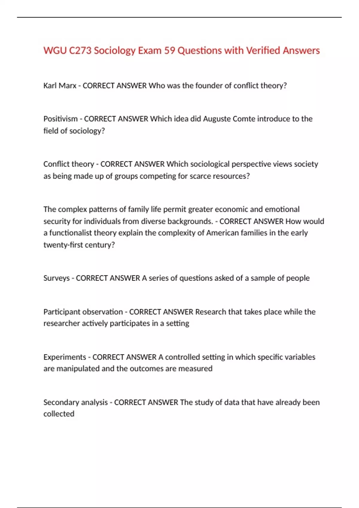 WGU C273 Sociology Exam 59 Questions with Verified Answers Karl Marx - CORRECT ANSWER Who was the founder of conflict theory? Positivism - CORRECT ANSWER Which idea did Auguste Comte introduce to the field of sociology? Conflict theory - CORRECT ANSWER Which sociological perspective views society as being made up of groups competing for scarce resources? The complex patterns of family life permit greater economic and emotional security for individuals from diverse backgrounds. - CORRECT ANSWER How would a functionalist theory explain the complexity of American families in the early twenty-first century? Surveys - CORRECT ANSWER A series of questions asked of a sample of people Participant observation - CORRECT ANSWER Research that takes place while the researcher actively participates in a setting Experiments - CORRECT ANSWER A controlled setting in which specific variables are manipulated and the outcomes are measured Secondary analysis - CORRECT ANSWER The study of data that have already been collected To protect human subjects - CORRECT ANSWER What is the purpose of having ethical standards in social research?