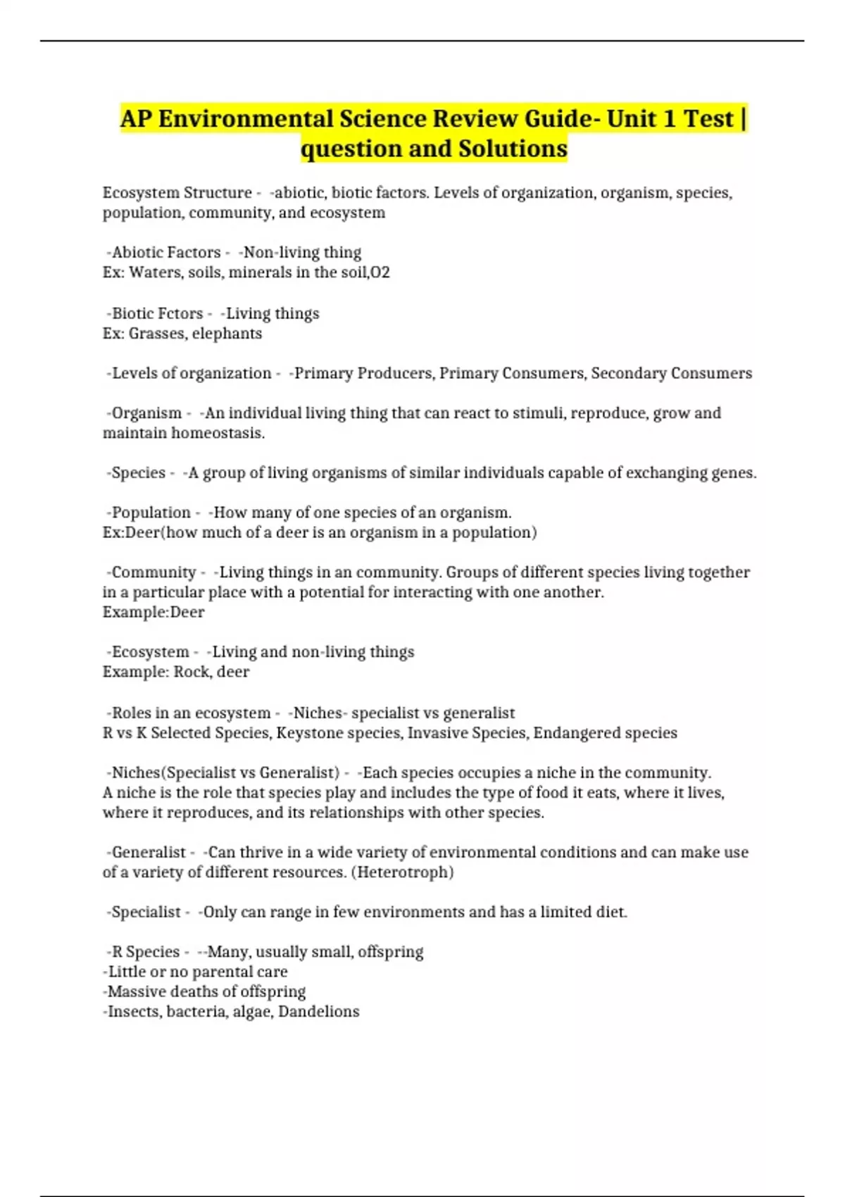 AP Environmental Science Review Guide- Unit 1 Test |