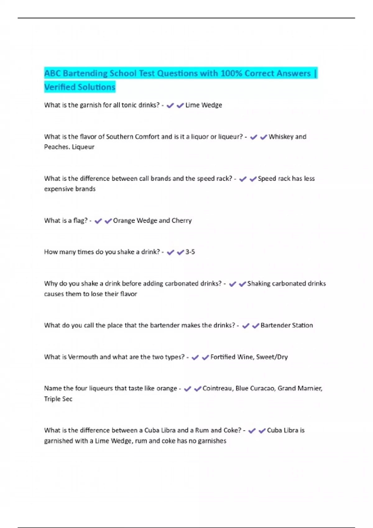 ABC Bartending School Test Questions with 100% Correct Answers | Verified Solutions