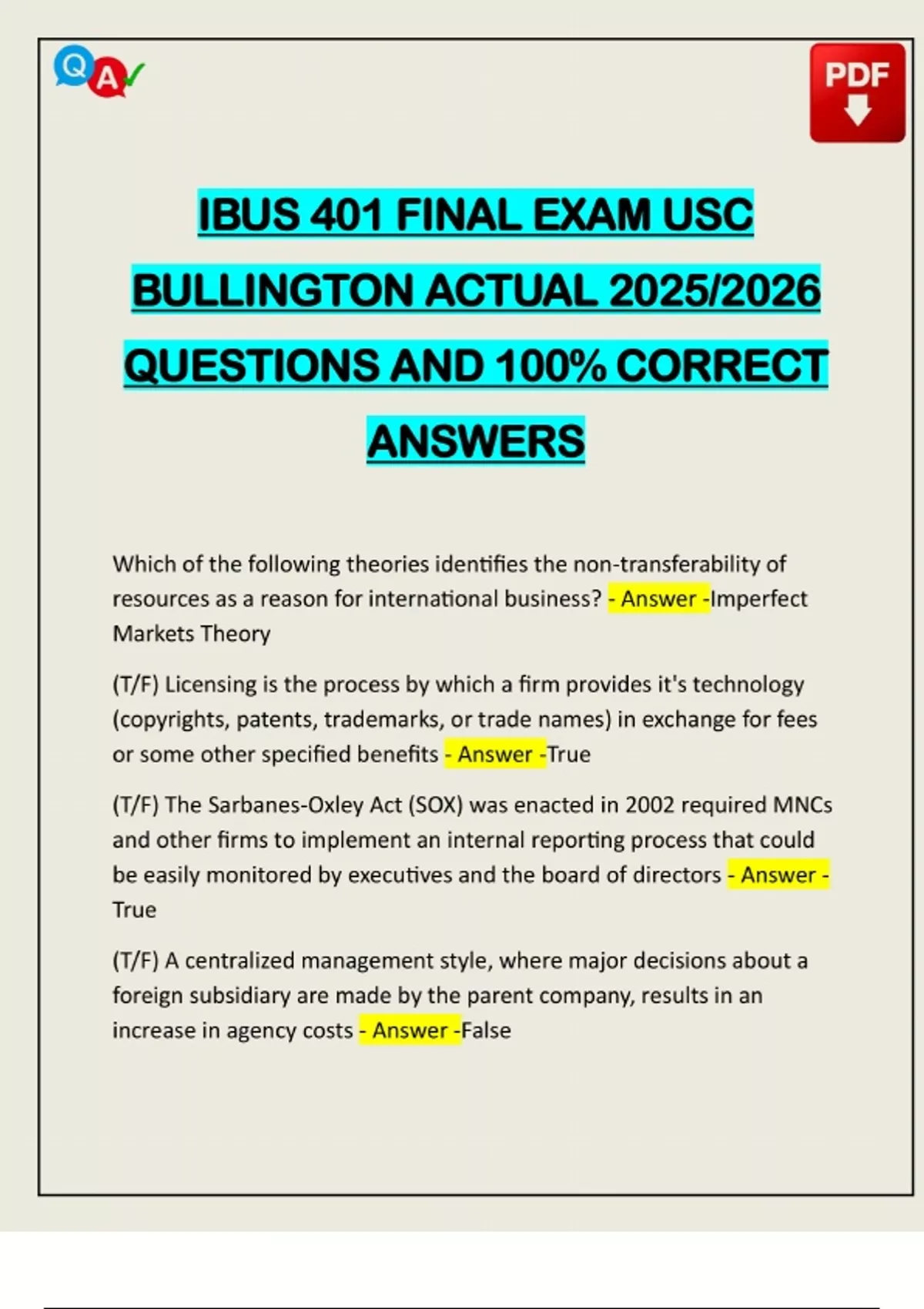 IBUS 401 FINAL EXAM USC BULLINGTON ACTUAL 2025/2026 QUESTIONS AND 100% CORRECT ANSWERS Which of the following theories identifies the non-transferability of resources as a reason for international business? - Answer -Imperfect Markets Theory (T/F) Licensing is the process by which a firm provides it's technology (copyrights, patents, trademarks, or trade names) in exchange for fees or some other specified benefits - Answer -True (T/F) The Sarbanes-Oxley Act (SOX) was enacted in 2002 required MNCs and other firms to implement an internal reporting process that could be easily monitored by executives and the board of directors - Answer - True (T/F) A centralized management style, where major decisions about a foreign subsidiary are made by the parent company, results in an increase in agency costs - Answer -FalseNeed assistance in Online classes, Exams & Assignments? Reach out for Full Course Assistance, Plagiarism-free Essay Writing, Research Paper & Discussion Posts. Confidential & Secure! Email now at: The primary component of the current account is the: - Answer - Balance of Trade Which of the following is mentioned in the text as a possible means by which a government may attempt to improve its balance of trade position (increase its exports or reduce its imports) - Answer -It could attempt to reduce its home currency value (T/F) A balance of trade deficit indicates an excess of imports over exports - Answer -True (T/F) A weakening of the U.S dollar with respect to the British poun