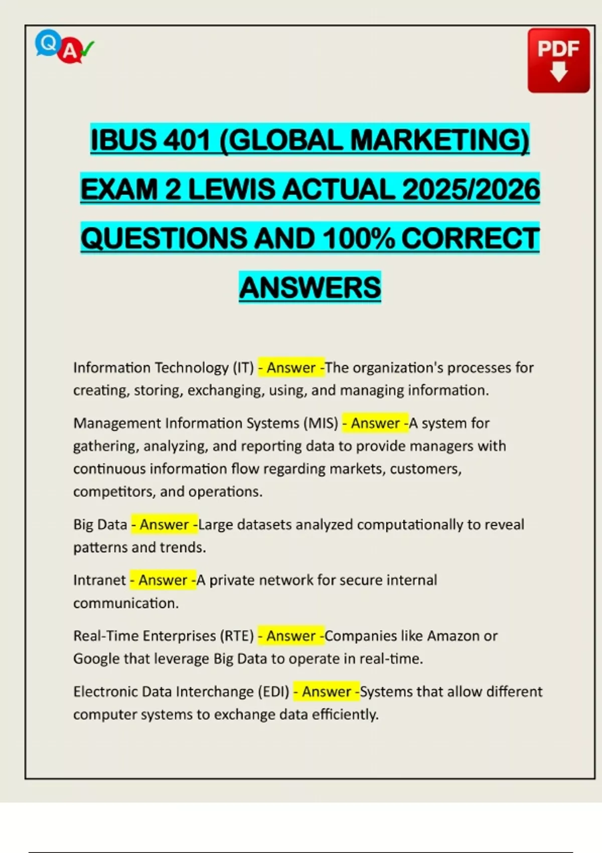 IBUS 401 (GLOBAL MARKETING) EXAM 2 LEWIS ACTUAL 2025/2026 QUESTIONS AND 100% CORRECT ANSWERS Information Technology (IT) - Answer -The organization's processes for creating, storing, exchanging, using, and managing information. Management Information Systems (MIS) - Answer -A system for gathering, analyzing, and reporting data to provide managers with continuous information flow regarding markets, customers, competitors, and operations. Big Data - Answer -Large datasets analyzed computationally to reveal patterns and trends. Intranet - Answer -A private network for secure internal communication. Real-Time Enterprises (RTE) - Answer -Companies like Amazon or Google that leverage Big Data to operate in real-time. Electronic Data Interchange (EDI) - Answer -Systems that allow different computer systems to exchange data efficiently.Need assistance in Online classes, Exams & Assignments? Reach out for Full Course Assistance, Plagiarism-free Essay Writing, Research Paper & Discussion Posts. Confidential & Secure! Email now at: Customer Relationship Management (CRM) - Answer -Involves maintaining two-way communication between a company and its customers. Touchpoints - Answer -Every interaction between the customer and the company. Sales Force Automation (SFA) - Answer -Software that automates sales and marketing tasks