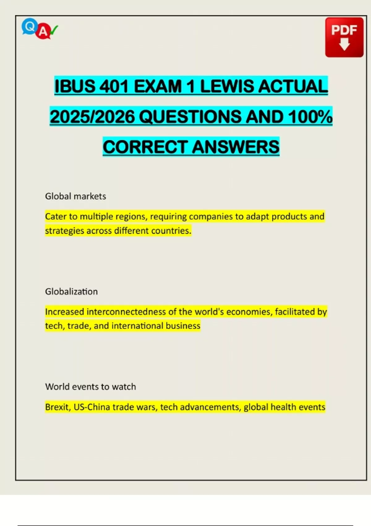 IBUS 401 EXAM 1 LEWIS ACTUAL 2025/2026 QUESTIONS AND 100% CORRECT ANSWERS Global markets Cater to multiple regions, requiring companies to adapt products and strategies across different countries. Globalization Increased interconnectedness of the world's economies, facilitated by tech, trade, and international business World events to watch Brexit, US-China trade wars, tech advancements, global health eventsNeed assistance in Online classes, Exams & Assignments? Reach out for Full Course Assistance, Plagiarism-free Essay Writing, Research Paper & Discussion Posts. Confidential & Secure! Email now at: Pros of globalization access to larger markets, efficiency through competition, technology transfer, foreign direct investment Cons of Globalization loss of local jobs, economic inequality, cultural homogeniza