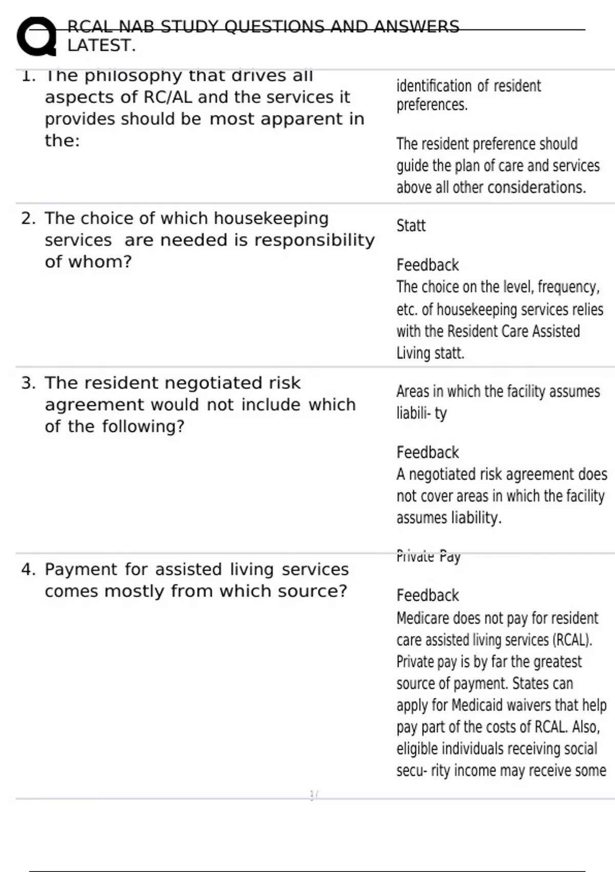 RCAL NAB STUDY QUESTIONS AND ANSWERS LATEST. 1. The philosophy that drives all aspects of RC/AL and the services it provides should be most apparent in the: 2. The choice of which housekeeping services are needed is responsibility of whom? 3. The resident negotiated risk agreement would not include which of the following? 4. Payment for assisted living services comes mostly from which source? identification of resident preferences. The resident preference should guide the plan of care and services above all other considerations. Statt Feedback The choice on the level, frequency, etc. of housekeeping services relies with the Resident Care Assisted Living statt. Areas in which the facility assumes liabili-