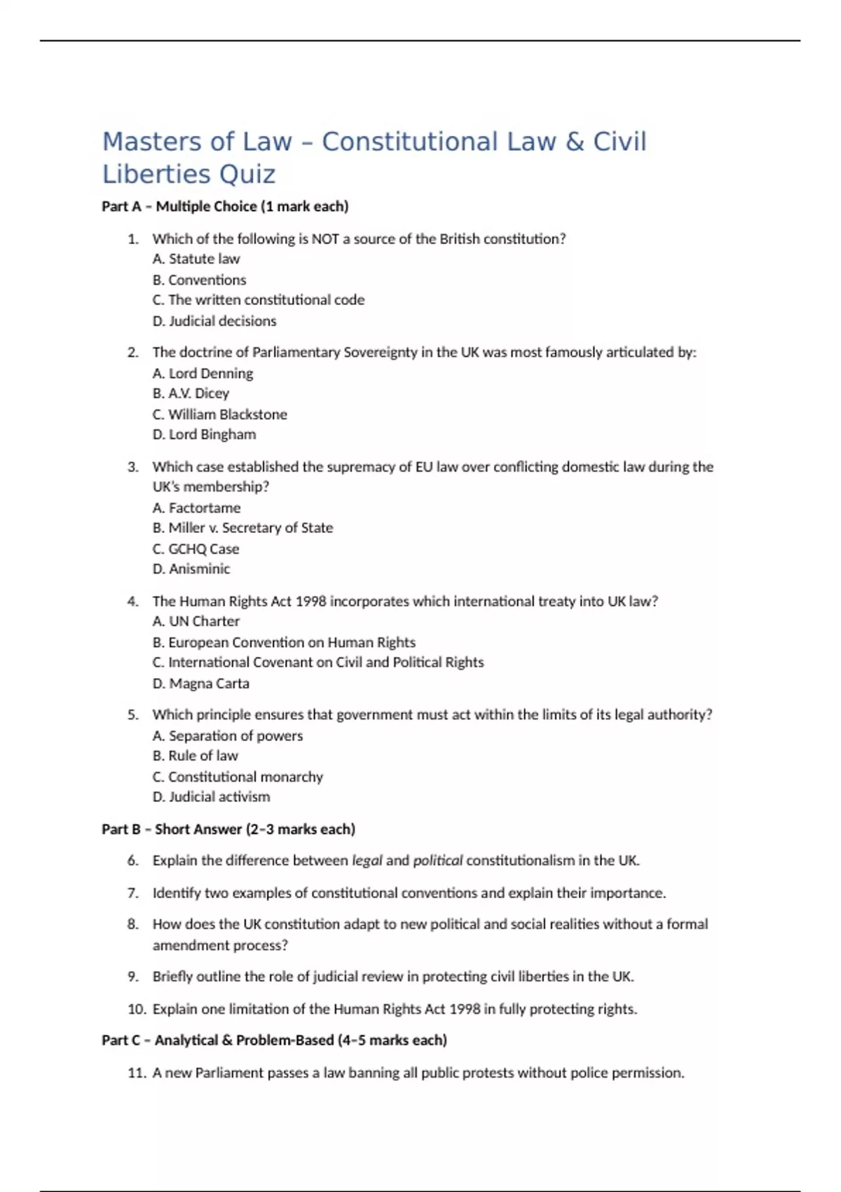 9. Briefly outline the role of judicial review in protecting civil liberties in the UK.