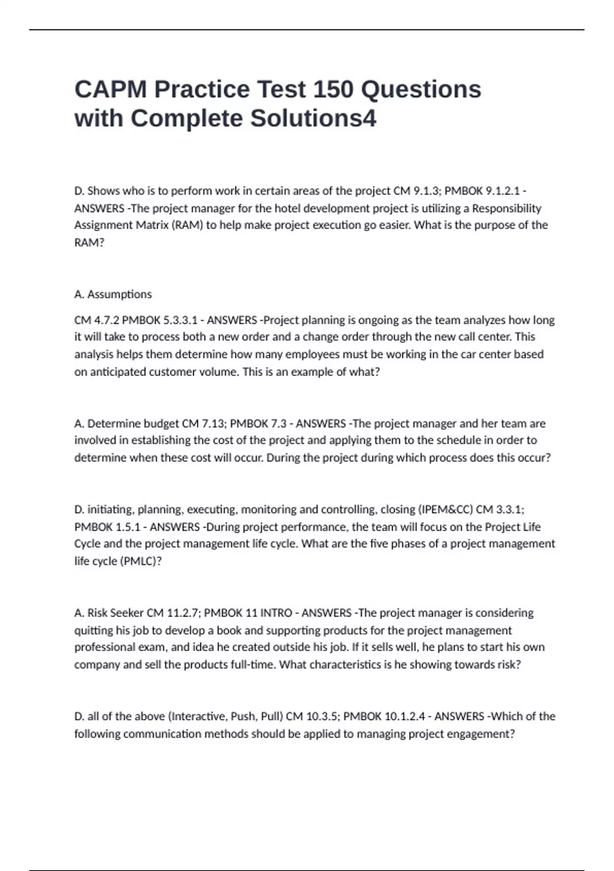 CAPM Practice Test 150 Questions with Complete Solutions D. Shows who is to perform work in certain areas of the project CM 9.1.3; PMBOK 9.1.2.1 - ANSWERS -The project manager for the hotel development project is utilizing a Responsibility Assignment Matrix (RAM) to help make project execution go easier. What is the purpose of the RAM? A. Assumptions CM 4.7.2 PMBOK 5.3.3.1 - ANSWERS -Project planning is ongoing as the team analyzes how long it will take to process both a new order and a change order through the new call center. This analysis helps them determine how many employees must be working in the car center based on anticipated customer volume. This is an example of what? A. Determine budget CM 7.13; PMBOK 7.3 - ANSWERS -The project manager and her team are involved in establishing the cost of the project and applying them to the schedule in order to determine when these cost will occur. During the project during which process does this occur? D. initiating, planning, executing, monitoring and controlling, closing (IPEM&CC) CM 3.3.1; PMBOK 1.5.1 - ANSWERS -During project performance, the team will focus on the Project Life Cycle and the project management life cycle. What are the five phases of a project management life cycle (PMLC)? A. Risk Seeker CM 11.2.7; PMBOK 11 INTRO - ANSWERS -The project manager is considering quitting his job to develop a book and supporting products for the project management professional exam, and idea he created outside his job. If it sells well, he plans to start his own company and sell the products full-time. What characteristics is he showing towards risk?