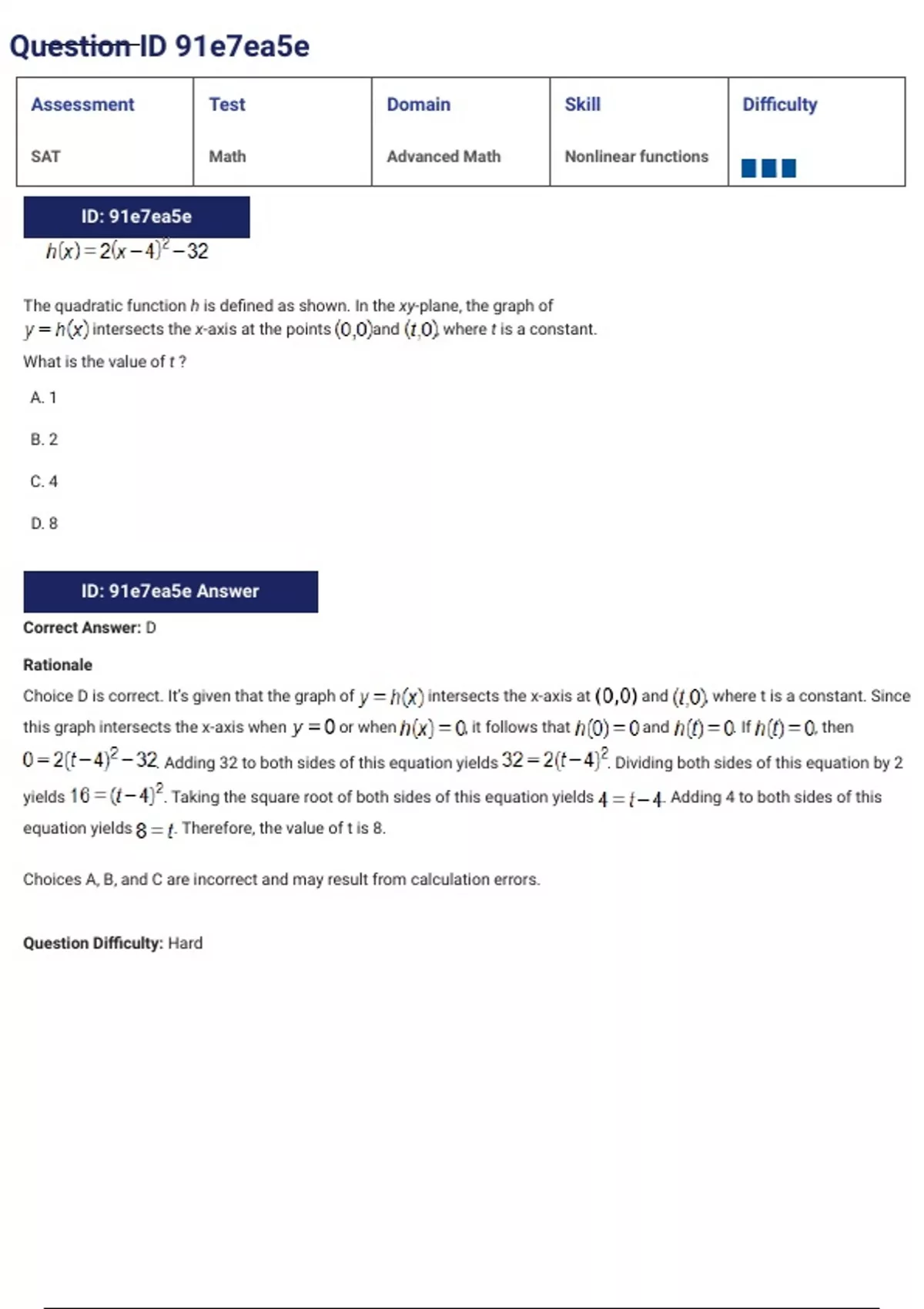 Choice D is correct. It’s given that the graph of intersects the x-axis at and , where t is a constant. Since