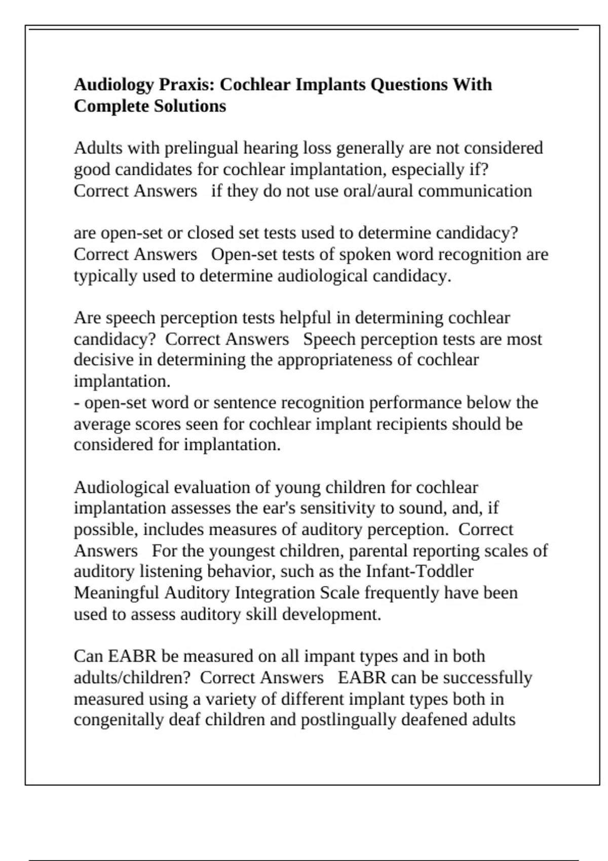 Audiology Praxis: Cochlear Implants Questions With Complete Solutions