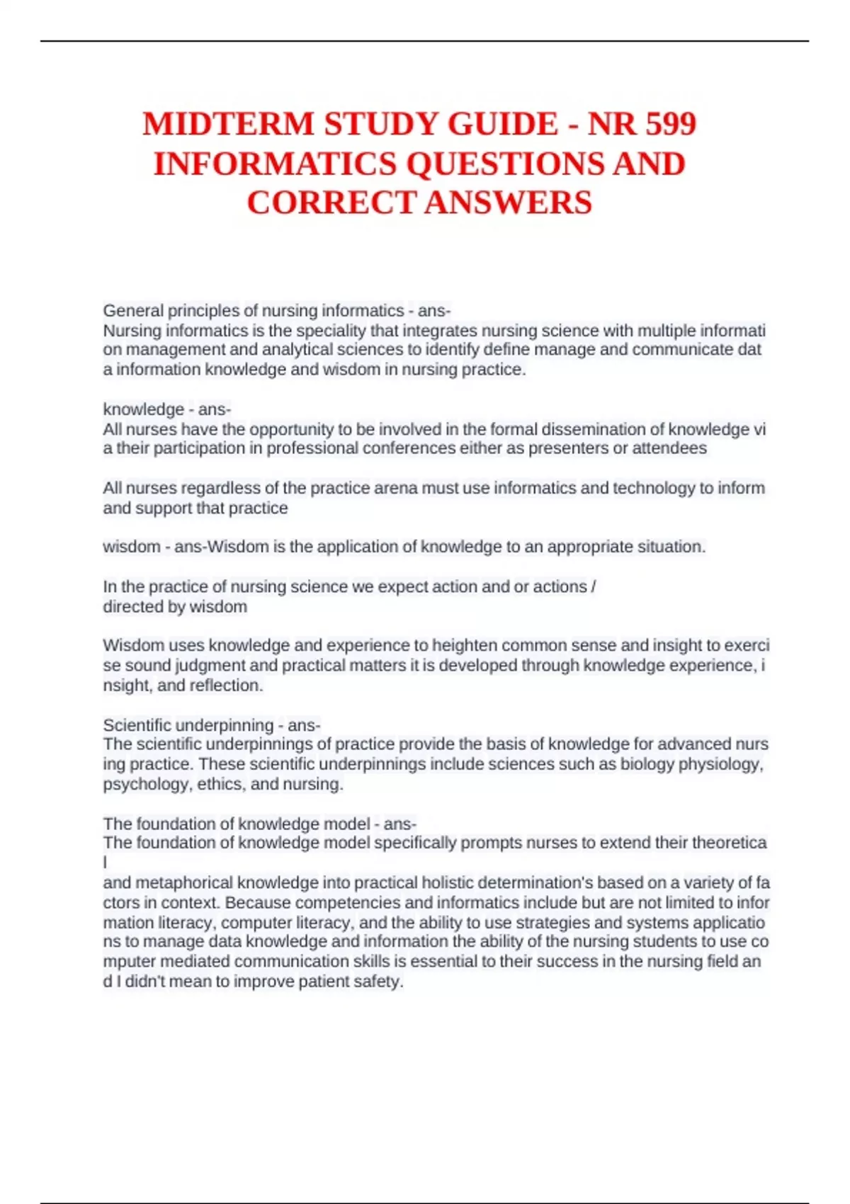 MIDTERM STUDY GUIDE - NR 599 INFORMATICS QUESTIONS AND CORRECT ANSWERS