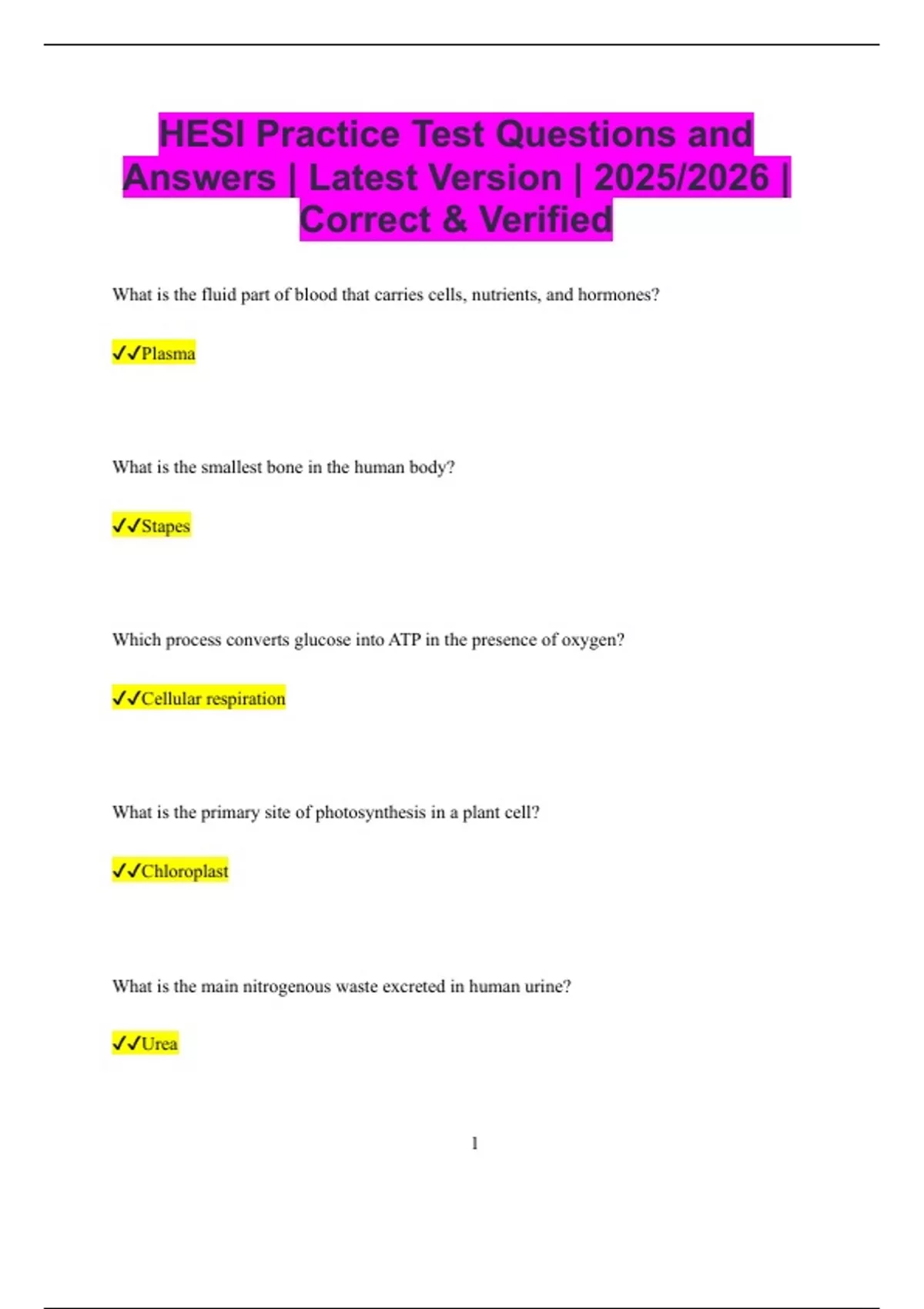 HESI Practice Test Questions and Answers | Latest Version | 2025/2026 | Correct & Verified What is the fluid part of blood that carries cells, nutrients, and hormones? Plasma What is the smallest bone in the human body? Stapes Which process converts glucose into ATP in the presence of oxygen? Cellular respiration What is the primary site of photosynthesis in a plant cell? Chloroplast What is the main nitrogenous waste excreted in human urine? Urea 2 Which element has the chemical symbol Fe? Iron What is the main structural carbohydrate in plant cell walls? Cellulose Which part of the brain controls breathing and heart rate? Medulla oblongata What is the process by which green plants release oxygen into the atmosphere? Photosynthesis Which type of bond is formed between oppositely charged ions? Ionic bond What is the molecule that provides direct energy for cellular work? ATP 3 Which part of the DNA molecule carries the genetic code? Nitrogenous bases What is the function of the epiglottis? Prevent food from entering the airway What is the main role of the lysosome in a cell? Digest waste and cellular debris Which type of reaction absorbs heat from its surroundings? Endothermic reaction Which molecule is the primary source of energy for cells? Glucose Which type of tissue connects bone to bone? Ligament 4 What is the chemical symbol for calcium? Ca What is the process by which mRNA is made from DNA? Transcription Which part of the human skeleton protects the brain? Cranium What is the functional unit of the kidney? Nephron What is the basic unit of life? Cell Which part of the brain controls balance and coordination? Cerebellum 5 What is the smallest particle of an element that retains its properties? Atom What is the chemical formula for water?