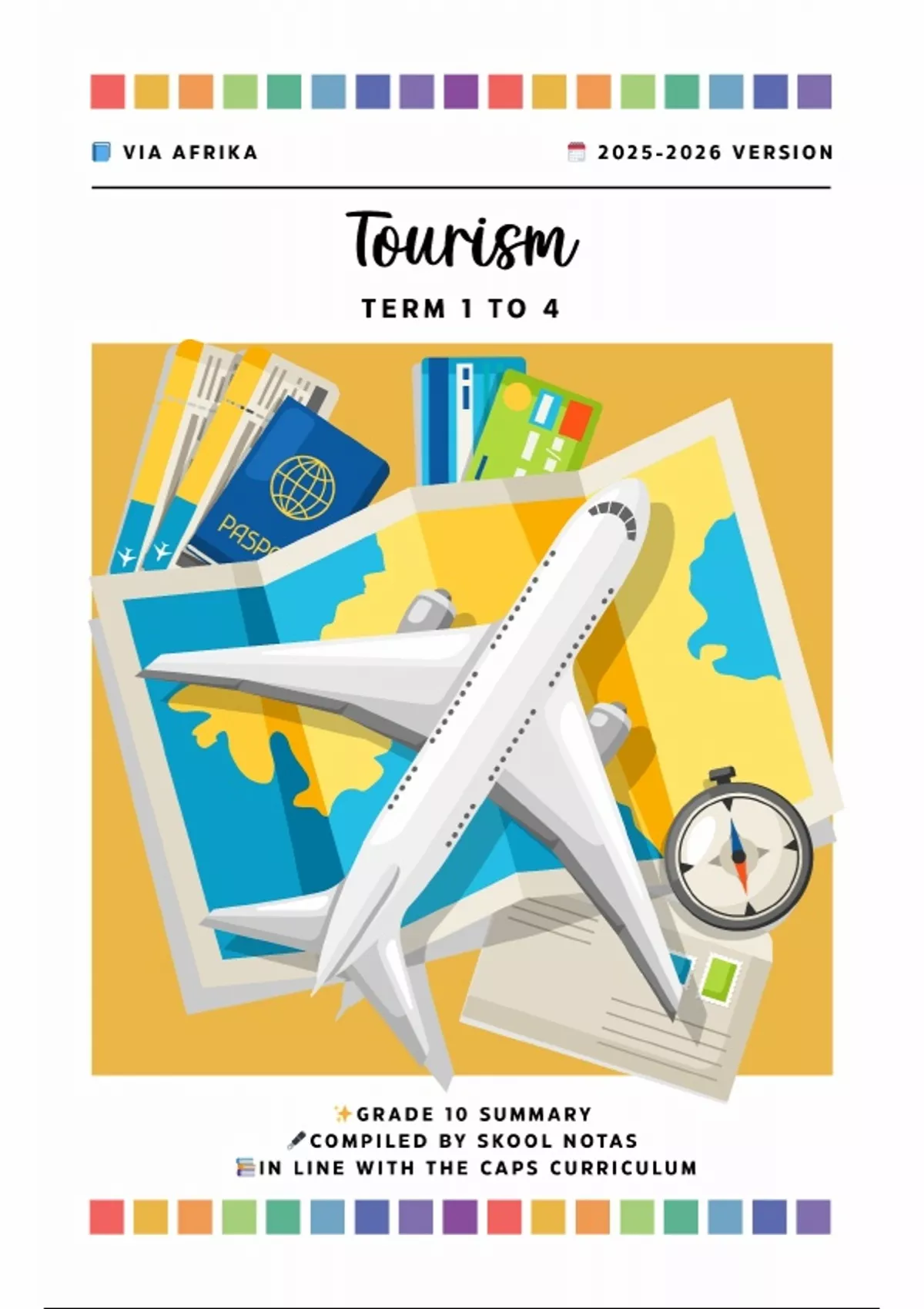 This document is a comprehensive summary of the Grade 10 Tourism curriculum based on the Via Afrika textbook, covering all four academic terms. It includes key topics such as tourism sectors, types of tourists, transport and accommodation, South African attractions, map work, domestic and sustainable tourism, marketing, and customer service. The content is well-structured with definitions, key terms, and examples, making it ideal for exam preparation or quick revision.