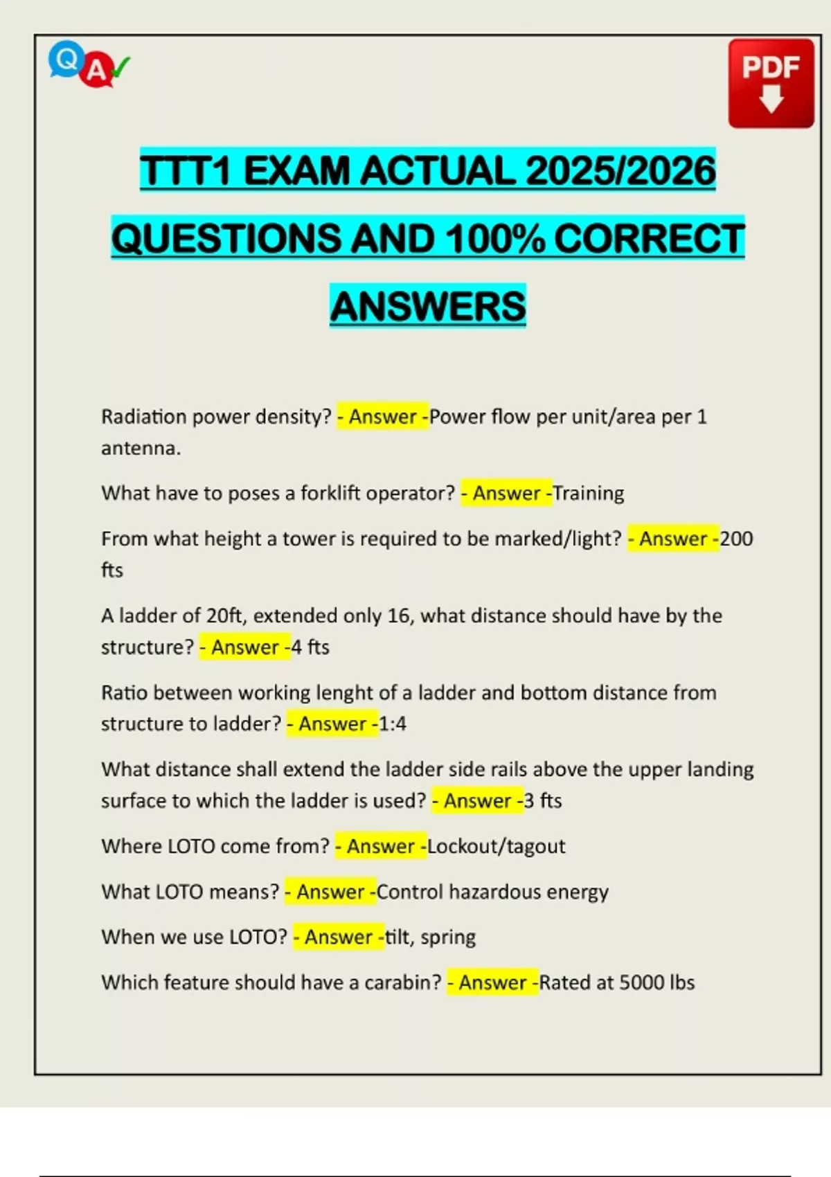 TTT1 EXAM ACTUAL 2025/2026 QUESTIONS AND 100% CORRECT ANSWERS Radiation power density? - Answer -Power flow per unit/area per 1 antenna. What have to poses a forklift operator? - Answer -Training From what height a tower is required to be marked/light? - Answer -200 fts A ladder of 20ft, extended only 16, what distance should have by the structure? - Answer -4 fts Ratio between working lenght of a ladder and bottom distance from structure to ladder? - Answer -1:4 What distance shall extend the ladder side rails above the upper landing surface to which the ladder is used? - Answer -3 ft