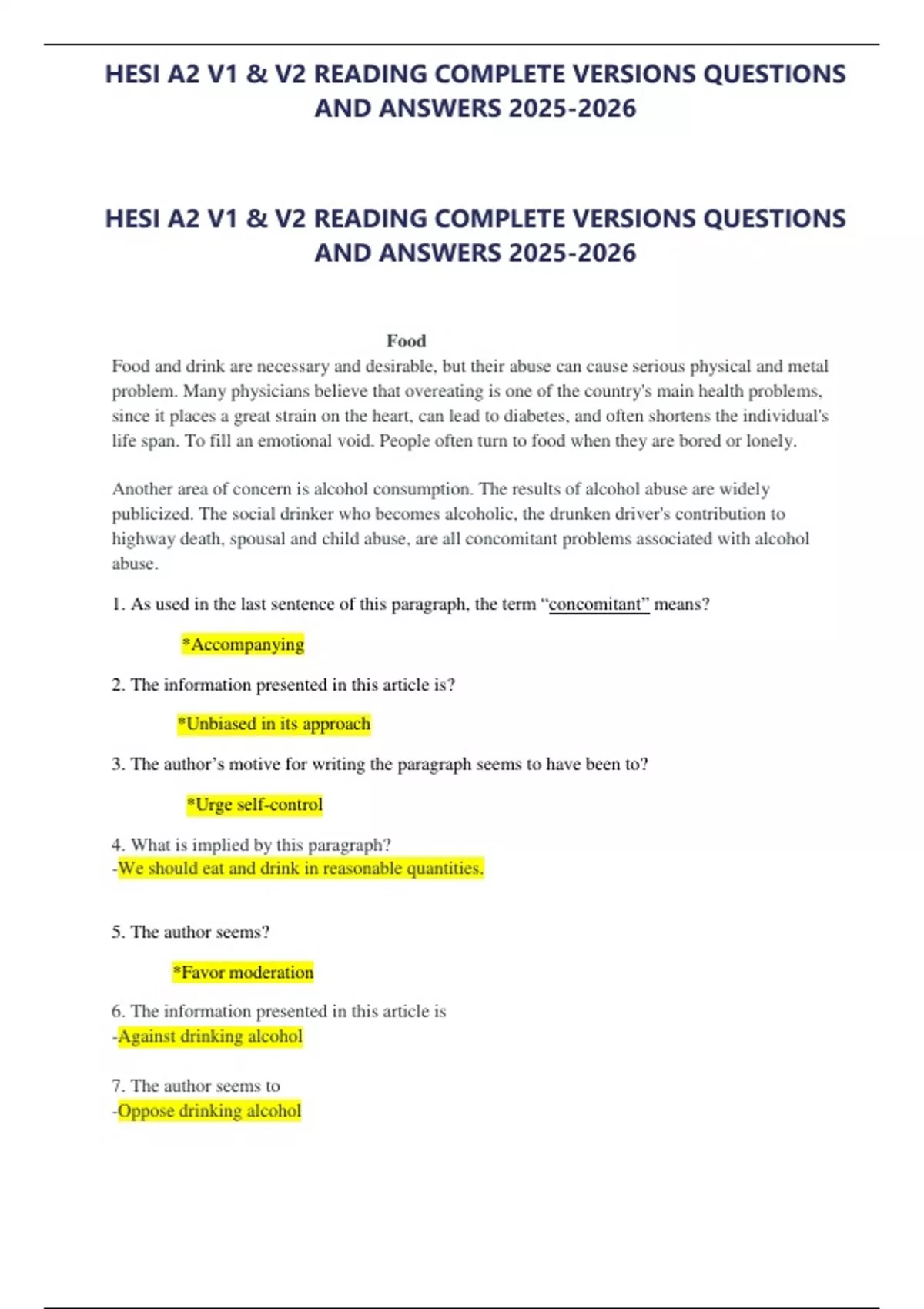 HESI A2 V1 & V2 READING COMPLETE VERSIONS QUESTIONS AND ANSWERS