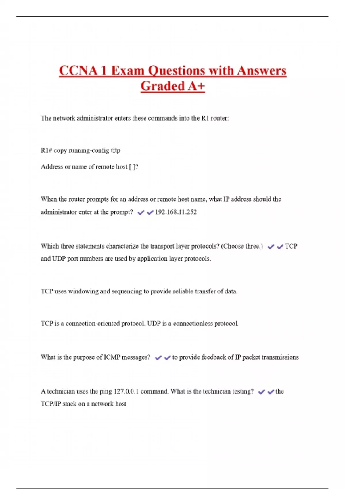 CCNA 1 Exam Questions with Answers Graded A+ The network administrator enters these commands into the R1 router: R1# copy running-config tftp Address or name of remote host [ ]? When the router prompts for an address or remote host name, what IP address should the administrator enter at the prompt? 192.168.11.252 Which three statements characterize the transport layer protocols? (Choose three.) and UDP port numbers are used by application layer protocols.