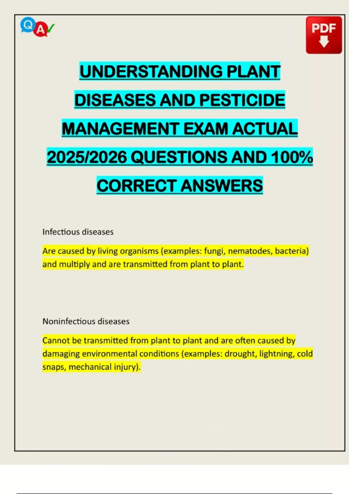 UNDERSTANDING PLANT DISEASES AND PESTICIDE MANAGEMENT EXAM ACTUAL 2025/2026 QUESTIONS AND 100% CORRECT ANSWERS Infectious diseases Are caused by living organisms (examples: fungi, nematodes, bacteria) and multiply and are transmitted from plant to plant. Noninfectious diseases Cannot be transmitted from plant to plant and are often caused by damaging environmental conditions (examples: drought, lightning, cold snaps, mechanical injury).Need assistance in Online classes, Exams & Assignments? Reach out for Full Course Assistance, Plagiarism-free Essay Writing, Research Paper & Discussion Posts. Confidential & Secure! Email now at: Symptoms of noninfectious diseases Stunting, scorch, distorted leaves. Four groups of infectious disease organisms 1. Spores spread by rain, wind, insects, seeds, equipment, soil or water. 2. Bacteria: Single-celled organisms; usually enter through plant wounds. 3. Viruses: Genetic particles; commonly transmitted by insects and seeds. 4. Nematodes: Microscopic roundworms that live on plant roots or other plant parts. Examples of infectious disease organisms 1. Leaf spots, root rots. 2. Crown gall, soft rot, certain cankers. 3. Mosaics, mottles. 4. Soybean cyst n