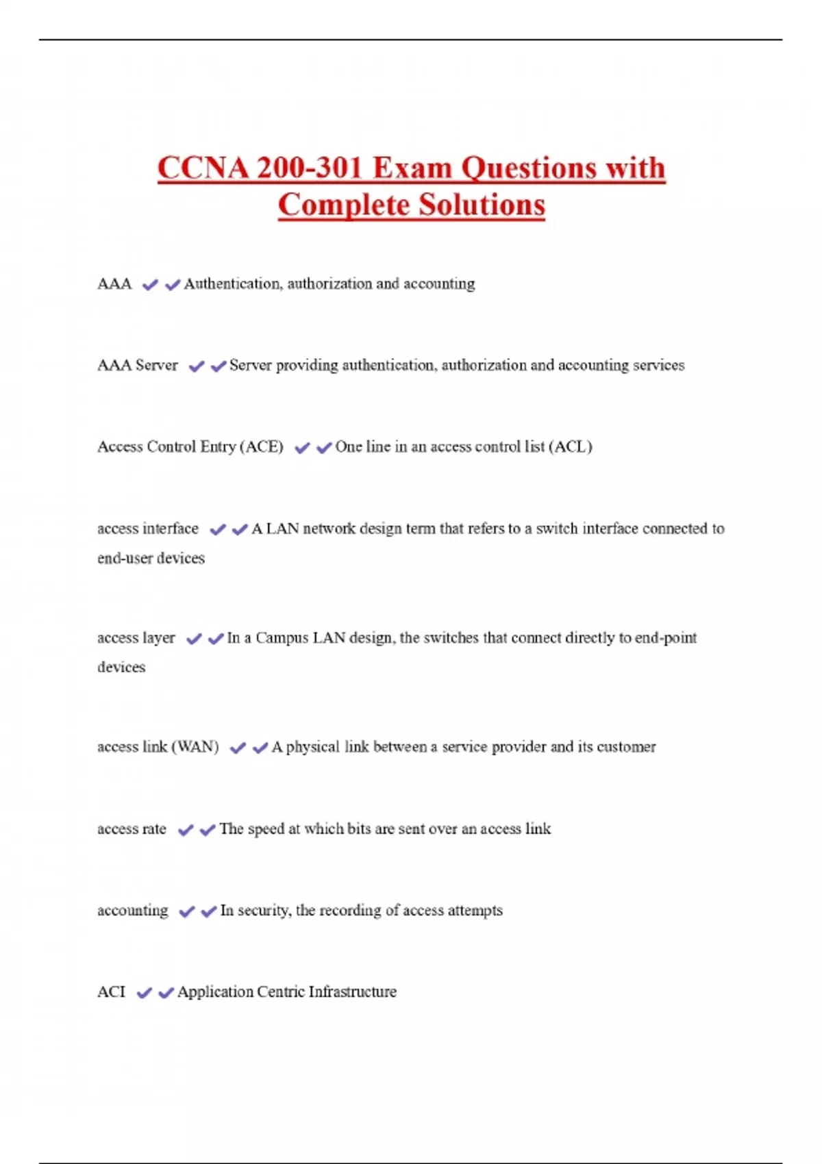 CCNA 200-301 Exam Questions with Complete Solutions AAA AAA Server Authentication, authorization and accounting Server providing authentication, authorization and accounting services Access Control Entry (ACE) access interface One line in an access control list (ACL) A LAN network design term that refers to a switch interface connected to end-user devices access layer devices