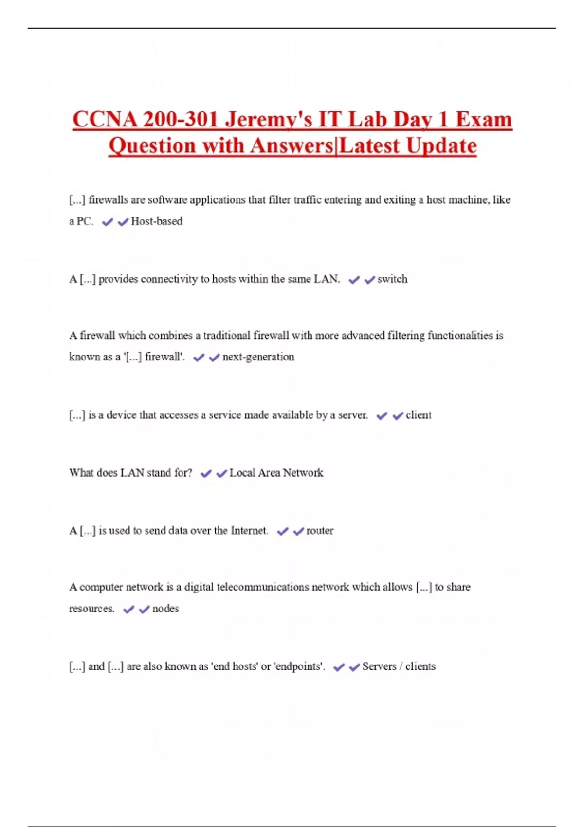 CCNA 200-301 Jeremy's IT Lab Day 1 Exam Question with Answers|Latest Update [...] firewalls are software applications that filter traffic entering and exiting a host machine, like a PC. Host-based A [...] provides connectivity to hosts within the same LAN. switch A firewall which combines a traditional firewall with more advanced filtering functionalities is known as a '[...] firewall'. next-generation [...] is a device that accesses a service made available by a server. What does LAN stand for? Local Area Network A [...] is used to send data over the Internet. router