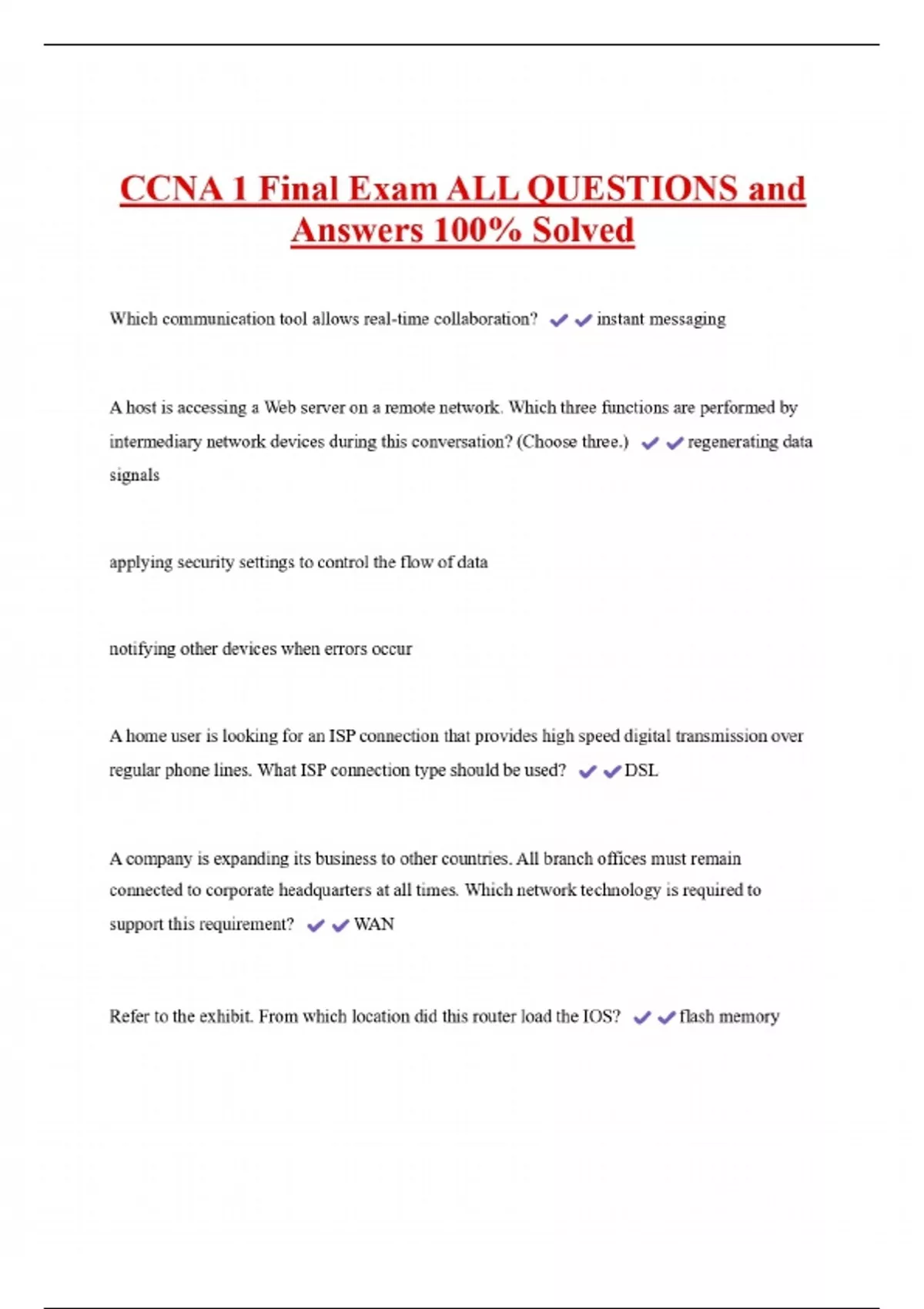 CCNA 1 Final Exam ALL QUESTIONS and Answers 100% Solved Which communication tool allows real-time collaboration? instant messaging A host is accessing a Web server on a remote network. Which three functions are performed by intermediary network devices during this conversation? (Choose three.) signals applying security settings to control the flow of data notifying other devices when errors occur