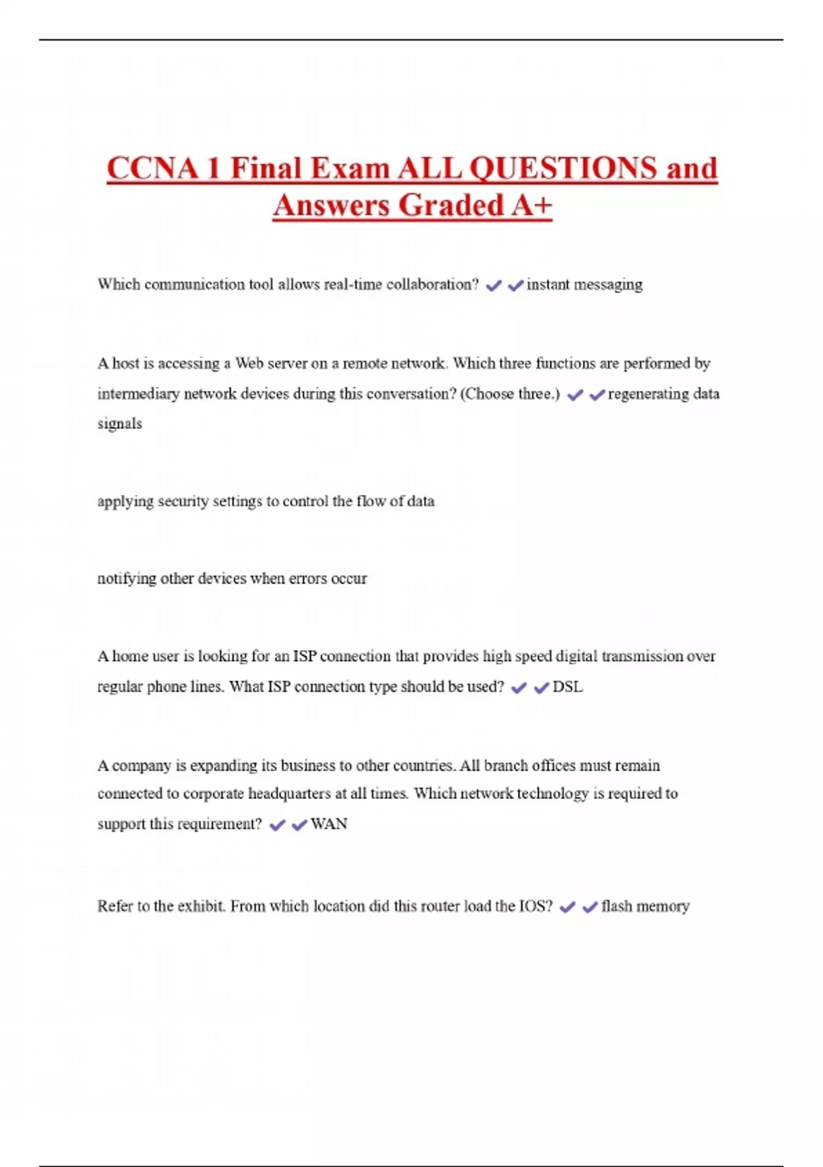 CCNA 1 Final Exam ALL QUESTIONS and Answers Graded A+ Which communication tool allows real-time collaboration? instant messaging A host is accessing a Web server on a remote network. Which three functions are performed by intermediary network devices during this conversation? (Choose three.) signals applying security settings to control the flow of data notifying other devices when errors occur
