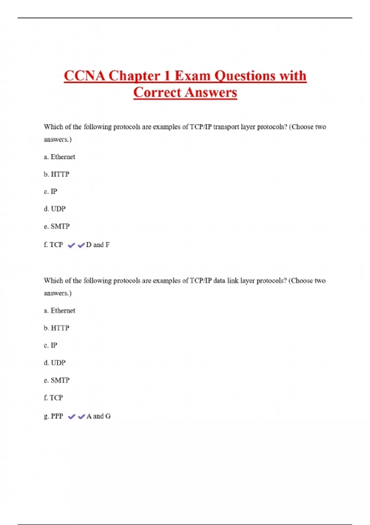 CCNA Chapter 1 Exam Questions with Correct Answers Which of the following protocols are examples of TCP/IP transport layer protocols? (Choose two answers.) a. Ethernet b. HTTP c. IP d. UDP e. SMTP f. TCP D and F Which of the following protocols are examples of TCP/IP data link layer protocols? (Choose two answers.) a. Ethernet b. HTTP c. IP d. UDP e. SMTP f. TCP g. PPP A and G