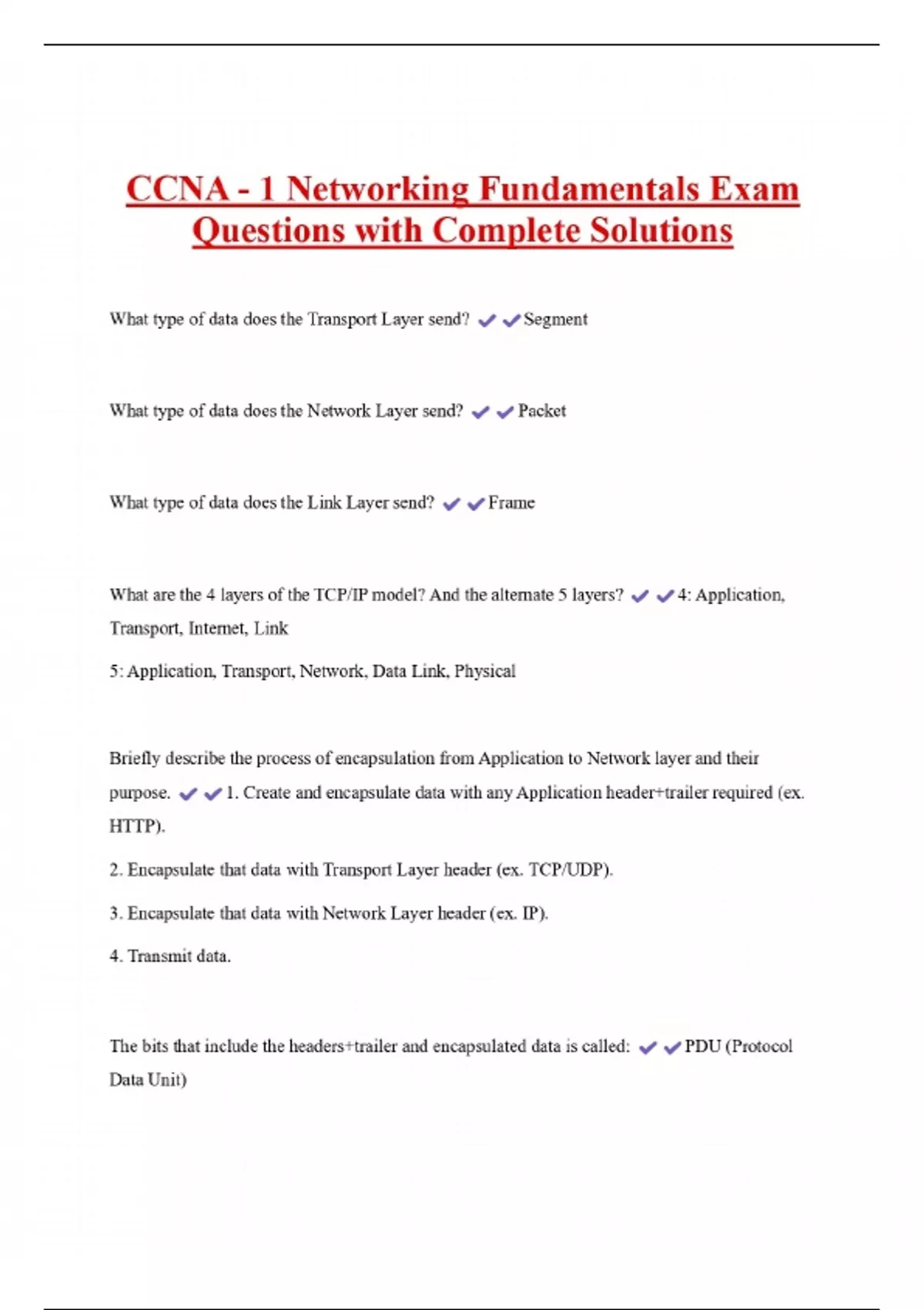 CCNA - 1 Networking Fundamentals Exam Questions with Complete Solutions What type of data does the Transport Layer send? What type of data does the Network Layer send? What type of data does the Link Layer send? Segment Packet Frame What are the 4 layers of the TCP/IP model? And the alternate 5 layers? Transport, Internet, Link 5: Application, Transport, Network, Data Link, Physical 4: Application, Briefly describe the process of encapsulation from Application to Network layer and their purpose. HTTP). 1. Create and encapsulate data with any Application header+trailer required (ex. 2. Encapsulate that data with Transport Layer header (ex. TCP/UDP). 3. Encapsulate that data with Network Layer header (ex. IP). 4. Transmit data.